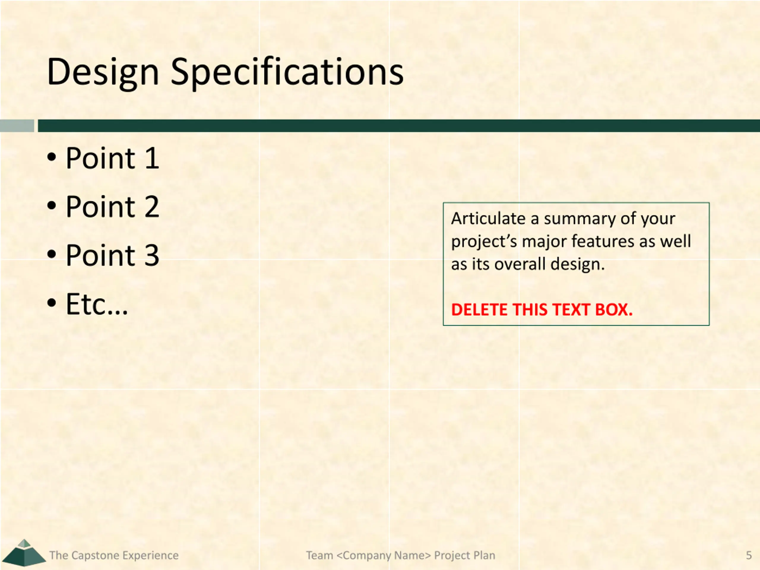 Design Specifications Point 1 Point 2 Point 3 Etc Articulate a summary of your project s major features as well as its overall design. DELETE THIS TEXT BOX. The Capstone Experience Team <Company Name> Project Plan 5