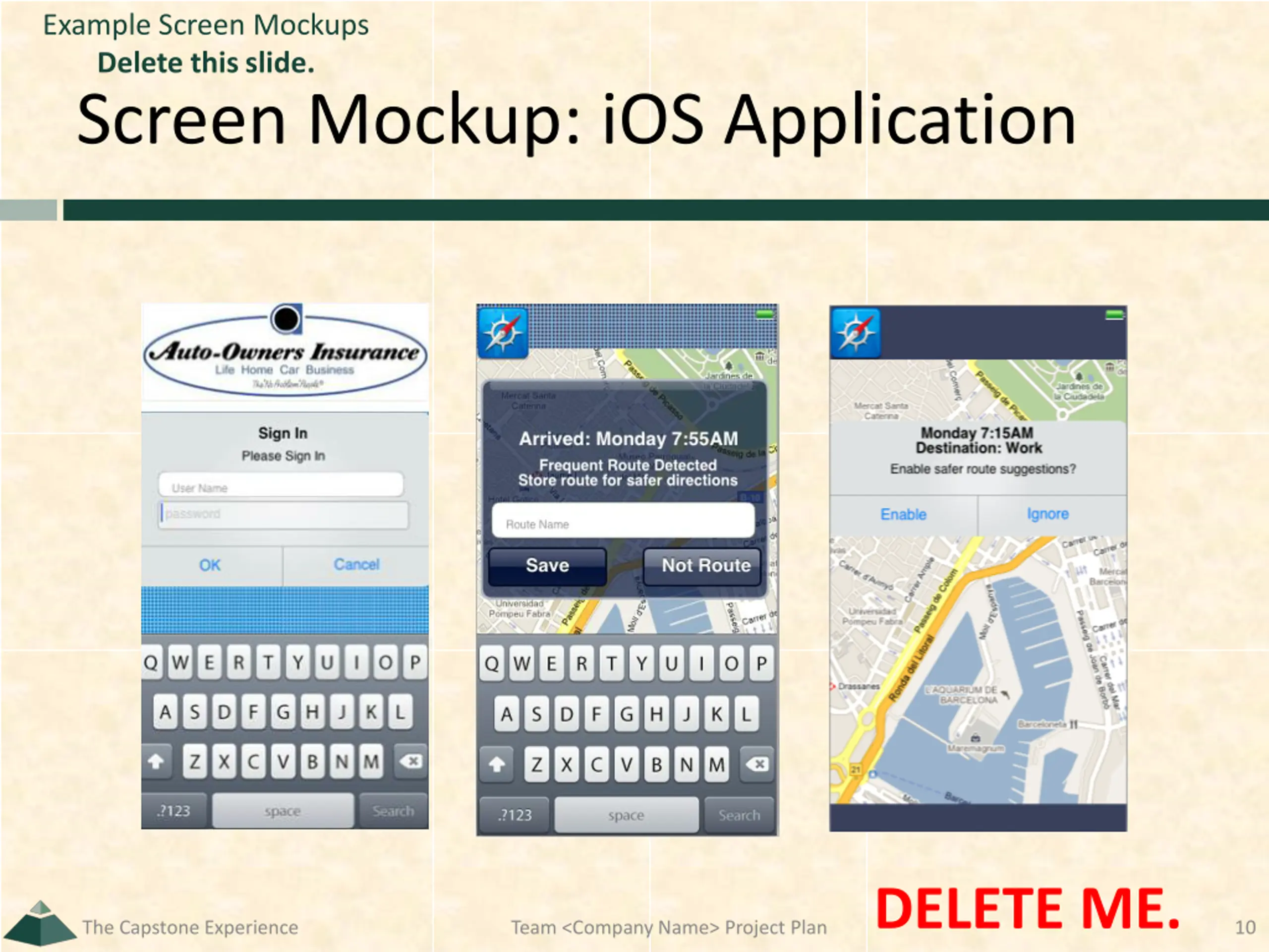 Example Screen Mockups Delete this slide. Screen Mockup: iOS Application DELETE ME. The Capstone Experience Team <Company Name> Project Plan 10