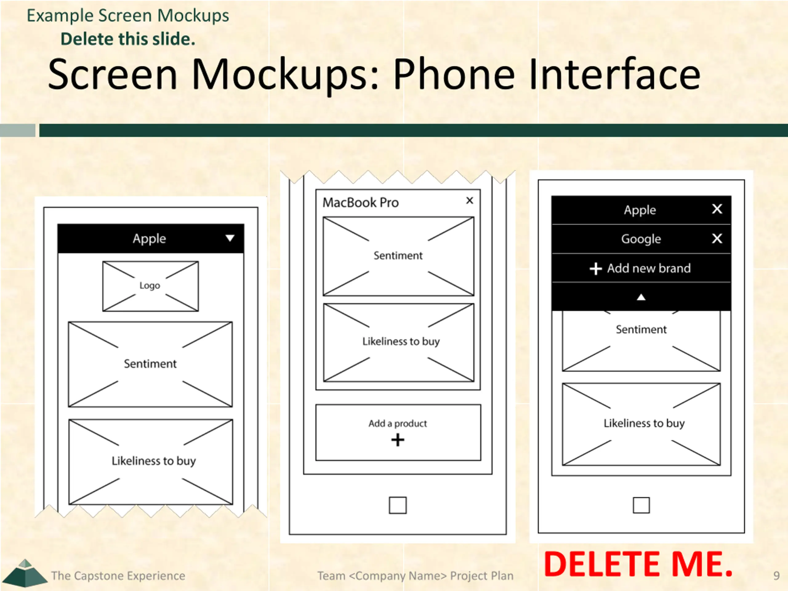 Example Screen Mockups Delete this slide. Screen Mockups: Phone Interface DELETE ME. The Capstone Experience Team <Company Name> Project Plan 9
