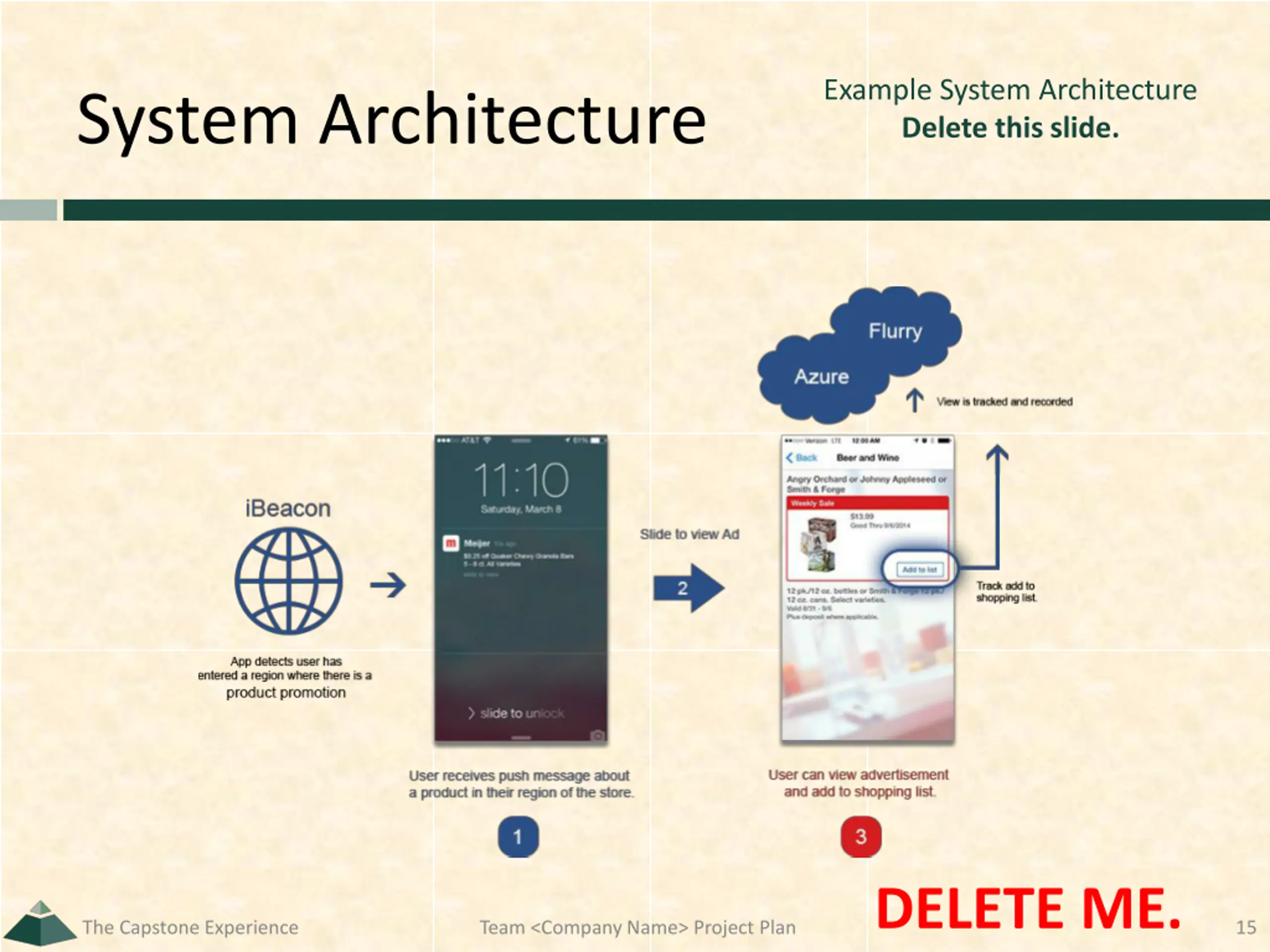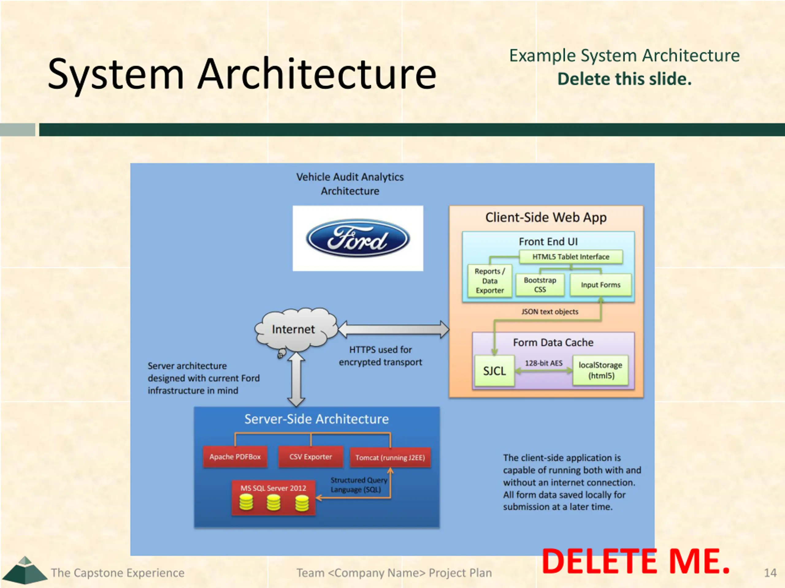 Example System Architecture Delete this slide. System Architecture DELETE ME. The Capstone Experience Team <Company Name> Project Plan 14