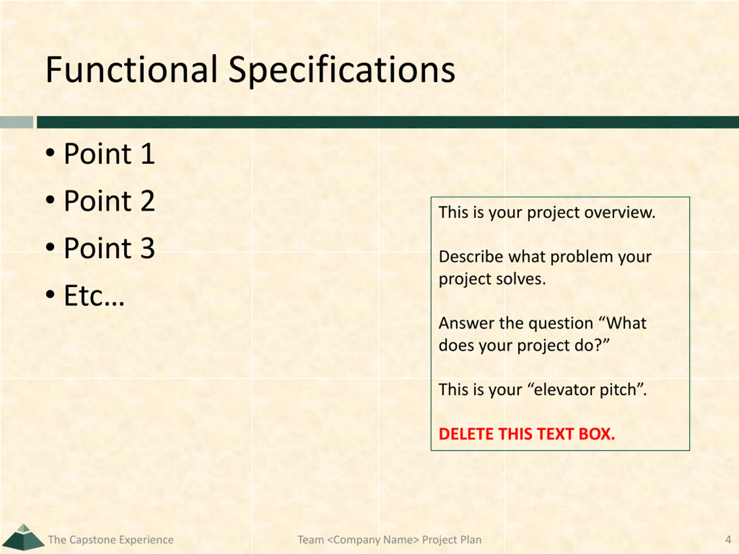 Functional Specifications Point 1 Point 2 Point 3 Etc This is your project overview. Describe what problem your project solves. Answer the question What does your project do? This is your elevator pitch . DELETE THIS TEXT BOX. The Capstone Experience Team <Company Name> Project Plan 4