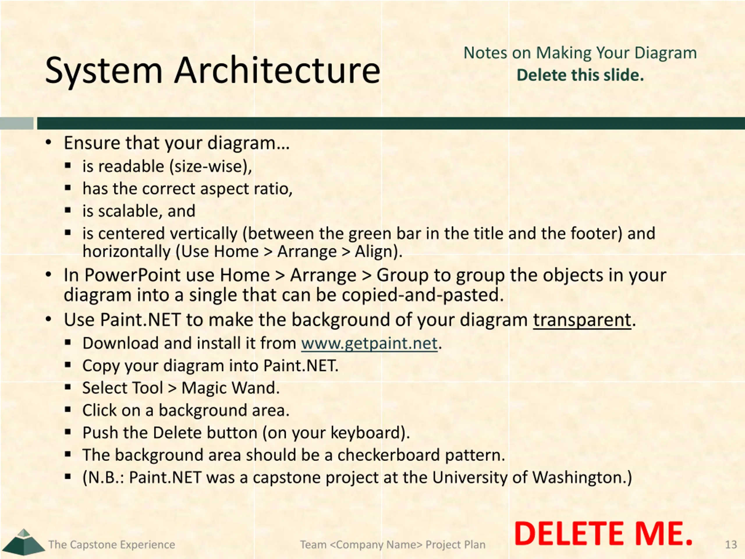 Notes on Making Your Diagram Delete this slide. System Architecture Ensure that your diagram is readable (size-wise), has the correct aspect ratio, is scalable, and is centered vertically (between the green bar in the title and the footer) and horizontally (Use Home > Arrange > Align). In PowerPoint use Home > Arrange > Group to group the objects in your diagram into a single that can be copied-and-pasted. Use Paint.NET to make the background of your diagram transparent. Download and install it from www.getpaint.net. Copy your diagram into Paint.NET. Select Tool > Magic Wand. Click on a background area. Push the Delete button (on your keyboard). The background area should be a checkerboard pattern. (N.B.: Paint.NET was a capstone project at the University of Washington.) DELETE ME. The Capstone Experience Team <Company Name> Project Plan 13