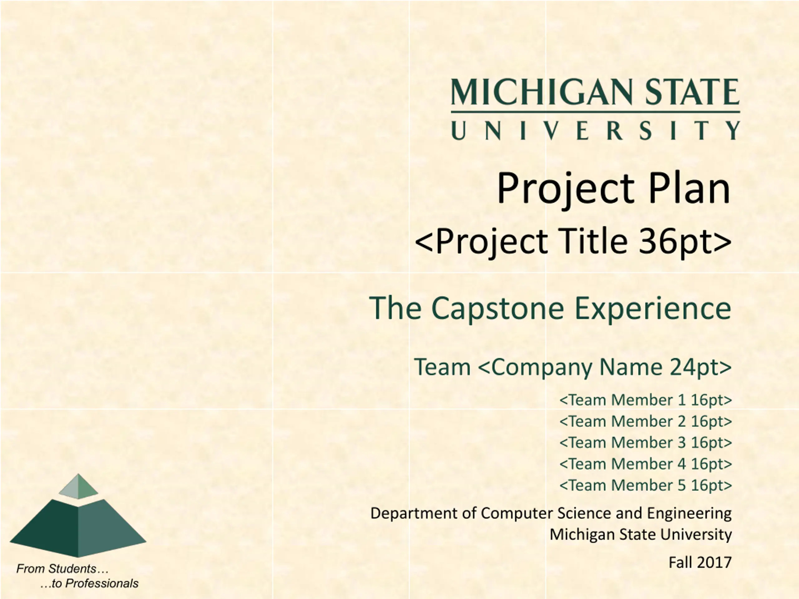 Project Plan <Project Title 36pt> The Capstone Experience Team <Company Name 24pt> <Team Member 1 16pt> <Team Member 2 16pt> <Team Member 3 16pt> <Team Member 4 16pt> <Team Member 5 16pt> D:\Users\wrd\Documents\CSE498\archive\logo\capstone-logo-green.png D:\Users\wrd\Documents\CSE498\archive\logo\capstone-logo-green.png Department of Computer Science and Engineering Michigan State University Fall 2017 From Students to Professionals