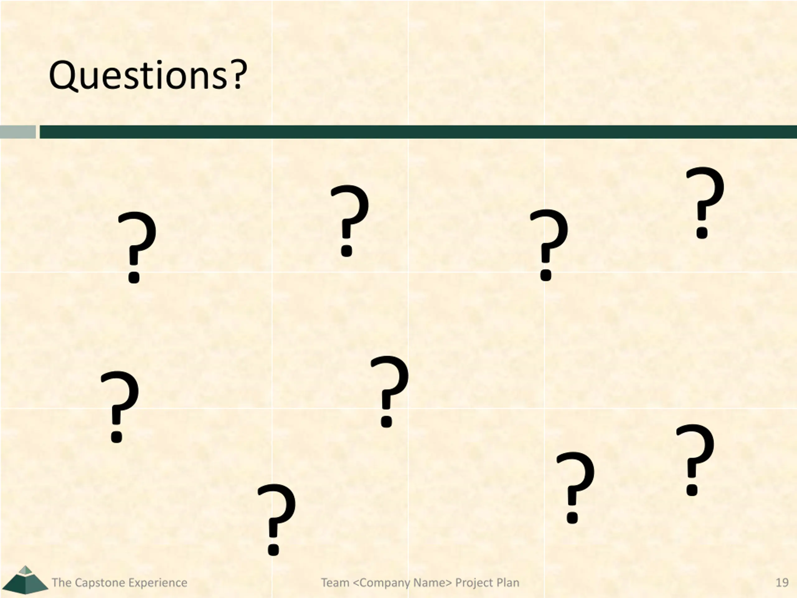 Questions? ? ? ? ? ? ? ? ? ? The Capstone Experience Team <Company Name> Project Plan 19