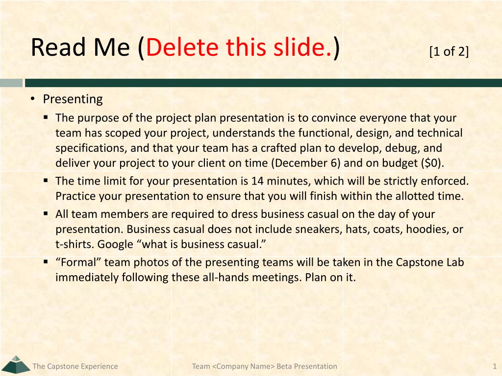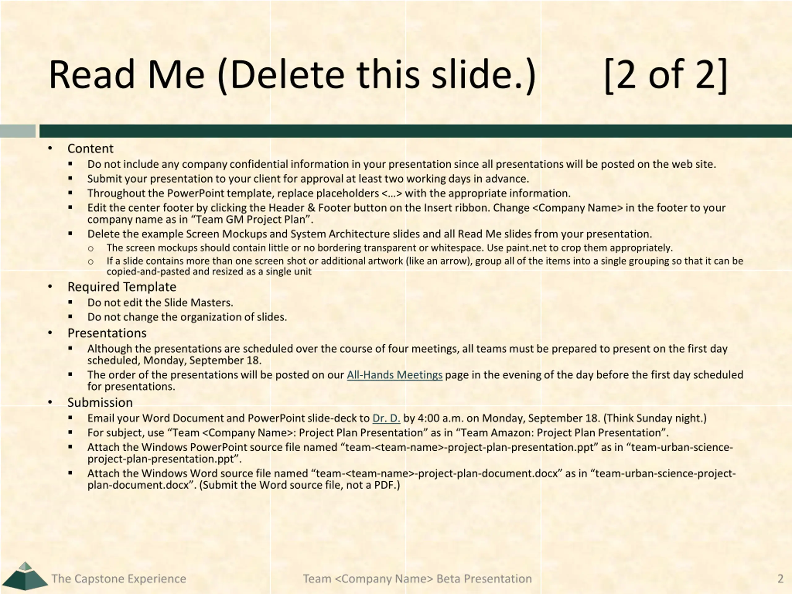 Read Me (Delete this slide.) [2 of 2] Content Do not include any company confidential information in your presentation since all presentations will be posted on the web site. Submit your presentation to your client for approval at least two working days in advance. Throughout the PowerPoint template, replace placeholders < > with the appropriate information. Edit the center footer by clicking the Header & Footer button on the Insert ribbon. Change <Company Name> in the footer to your company name as in Team GM Project Plan . Delete the example Screen Mockups and System Architecture slides and all Read Me slides from your presentation. o The screen mockups should contain little or no bordering transparent or whitespace. Use paint.net to crop them appropriately. o If a slide contains more than one screen shot or additional artwork (like an arrow), group all of the items into a single grouping so that it can be copied-and-pasted and resized as a single unit Required Template Do not edit the Slide Masters. Do not change the organization of slides. Presentations Although the presentations are scheduled over the course of four meetings, all teams must be prepared to present on the first day scheduled, Monday, September 18. The order of the presentations will be posted on our All-Hands Meetings page in the evening of the day before the first day scheduled for presentations. Submission Email your Word Document and PowerPoint slide-deck to Dr. D. by 4:00 a.m. on Monday, September 18. (Think Sunday night.) For subject, use Team <Company Name>: Project Plan Presentation as in Team Amazon: Project Plan Presentation . Attach the Windows PowerPoint source file named team-<team-name>-project-plan-presentation.ppt as in team-urban-science- project-plan-presentation.ppt . Attach the Windows Word source file named team-<team-name>-project-plan-document.docx as in team-urban-science-project- plan-document.docx . (Submit the Word source file, not a PDF.) The Capstone Experience Team <Company Name> Beta Presentation 2