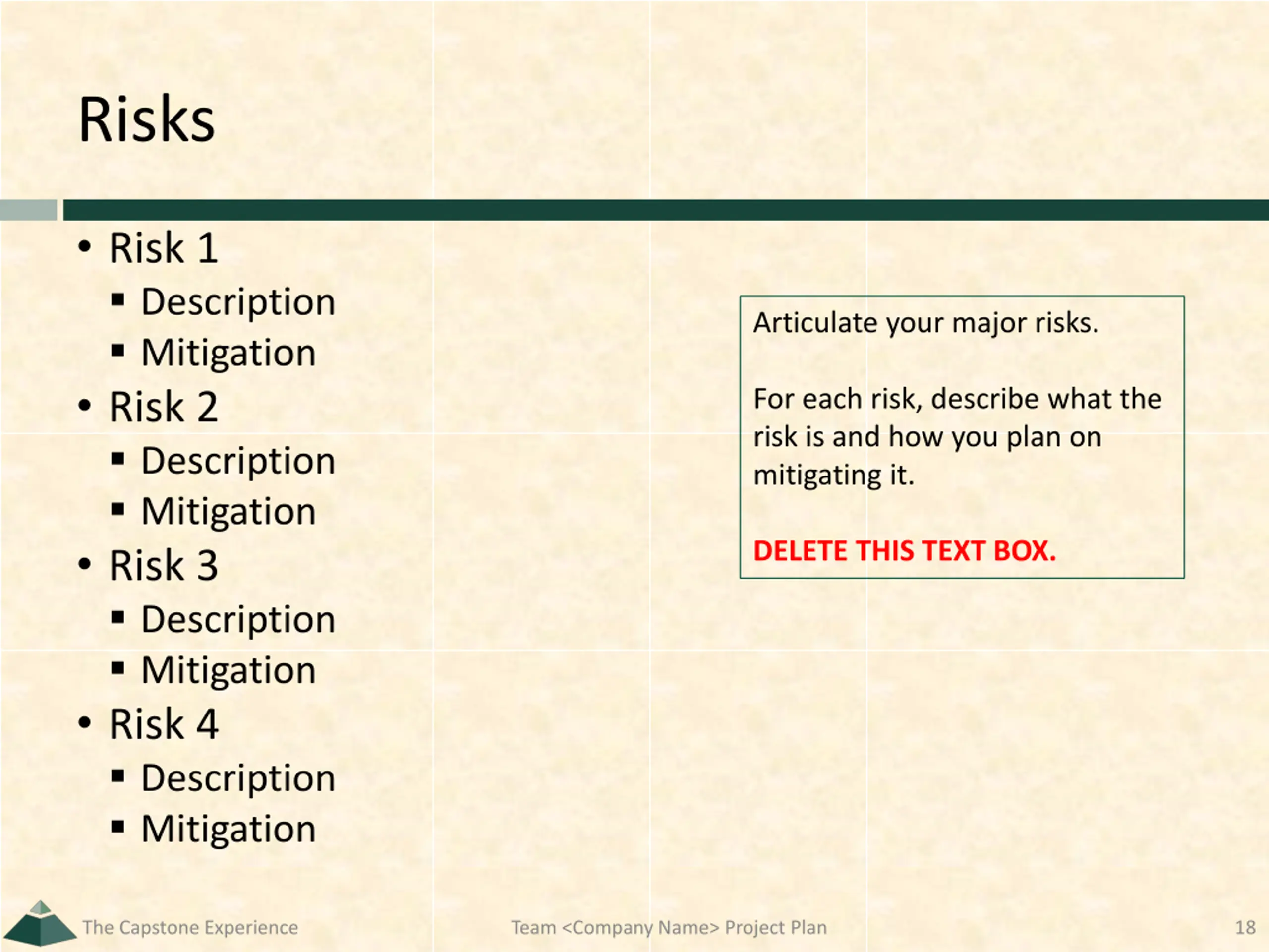 Risks Risk 1 Description Mitigation Risk 2 Description Mitigation Risk 3 Description Mitigation Risk 4 Description Mitigation Articulate your major risks. For each risk, describe what the risk is and how you plan on mitigating it. DELETE THIS TEXT BOX. The Capstone Experience Team <Company Name> Project Plan 18