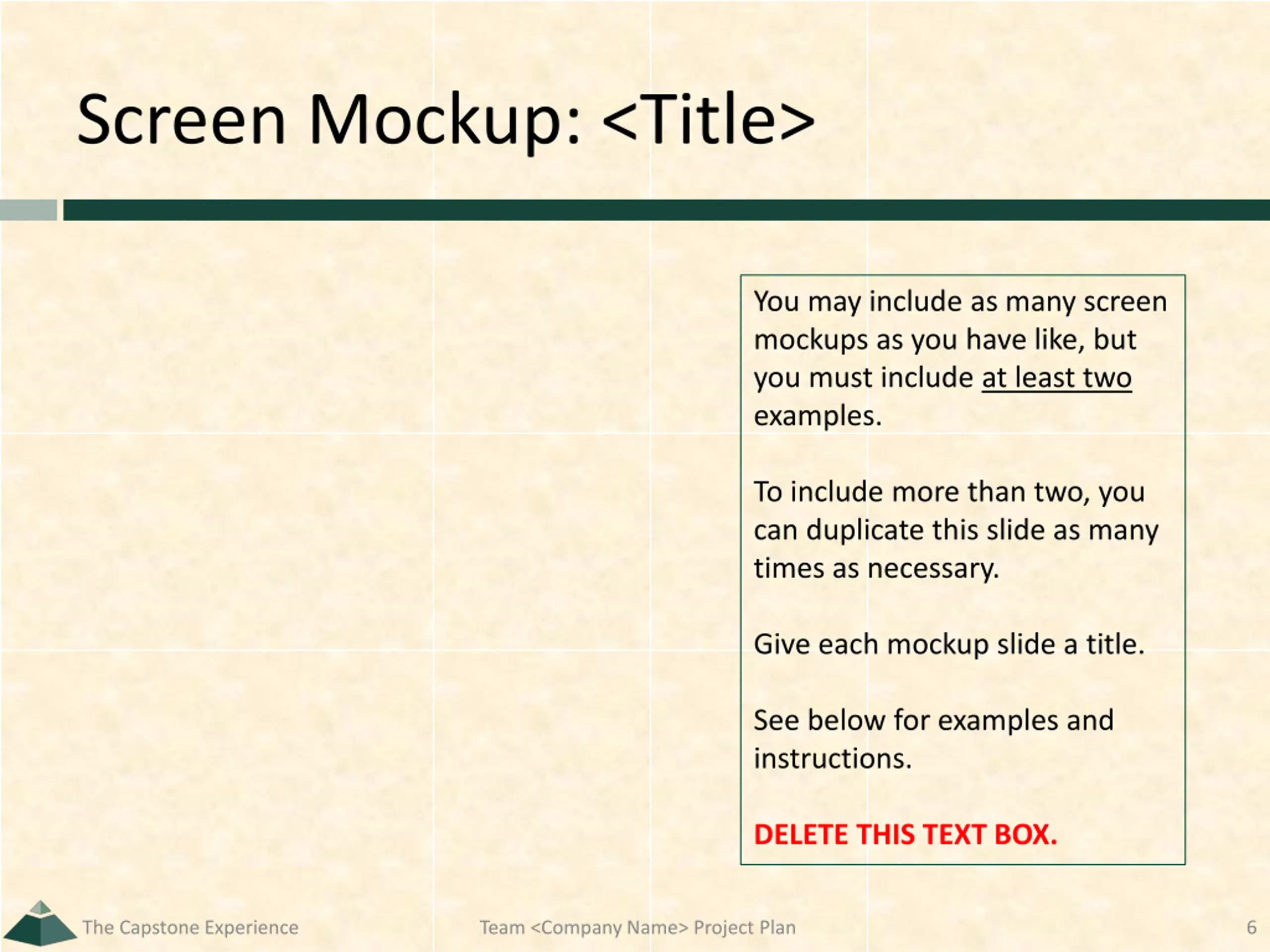 Screen Mockup: <Title> You may include as many screen mockups as you have like, but you must include at least two examples. To include more than two, you can duplicate this slide as many times as necessary. Give each mockup slide a title. See below for examples and instructions. DELETE THIS TEXT BOX. The Capstone Experience Team <Company Name> Project Plan 6