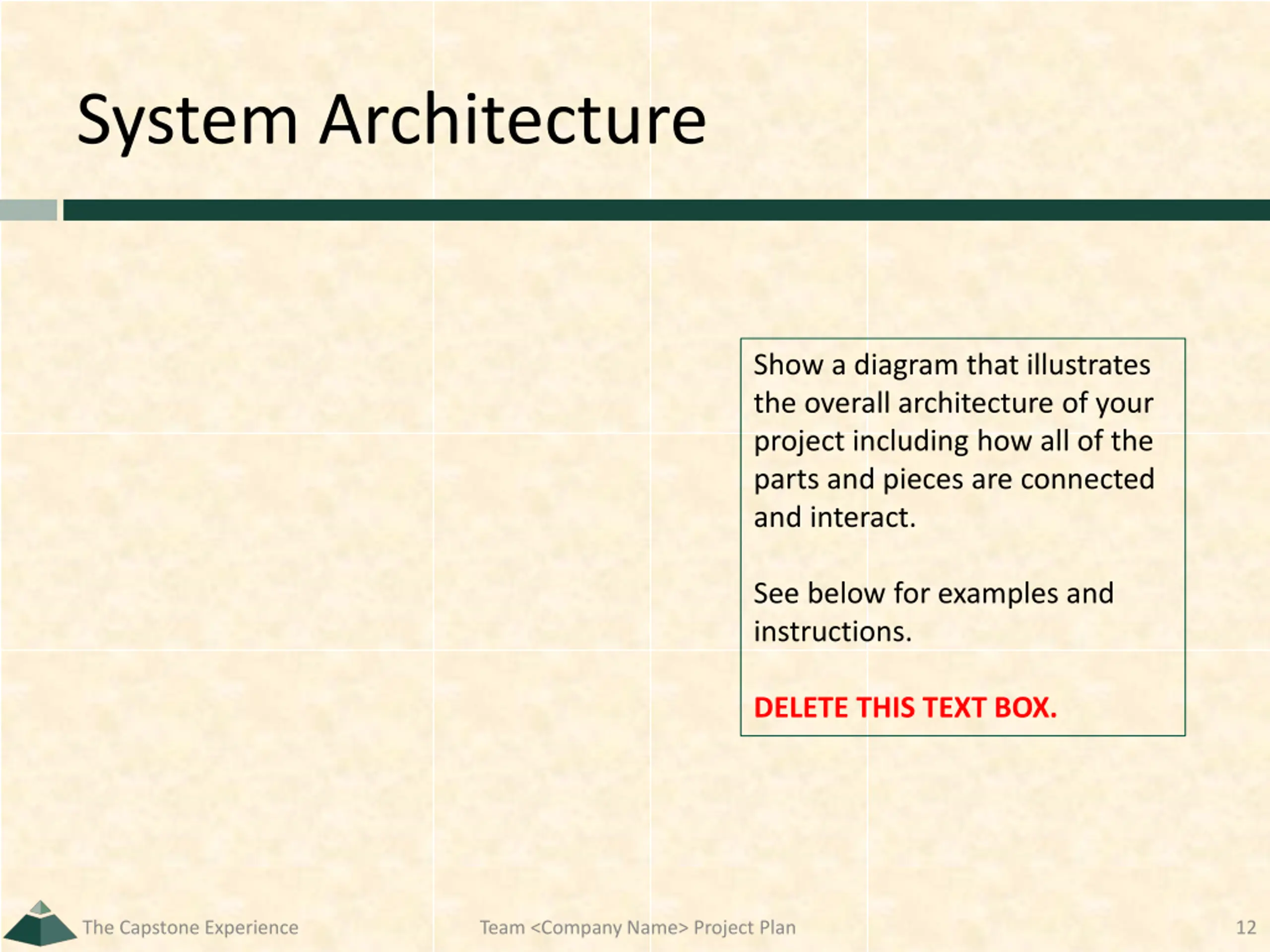 System Architecture Show a diagram that illustrates the overall architecture of your project including how all of the parts and pieces are connected and interact. See below for examples and instructions. DELETE THIS TEXT BOX. The Capstone Experience Team <Company Name> Project Plan 12