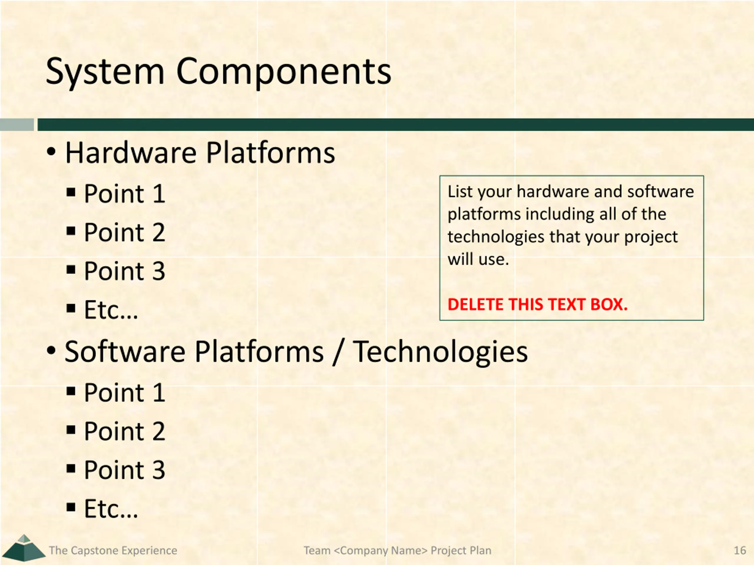 System Components Hardware Platforms Point 1 Point 2 Point 3 Etc Software Platforms / Technologies Point 1 Point 2 Point 3 Etc List your hardware and software platforms including all of the technologies that your project will use. DELETE THIS TEXT BOX. The Capstone Experience Team <Company Name> Project Plan 16