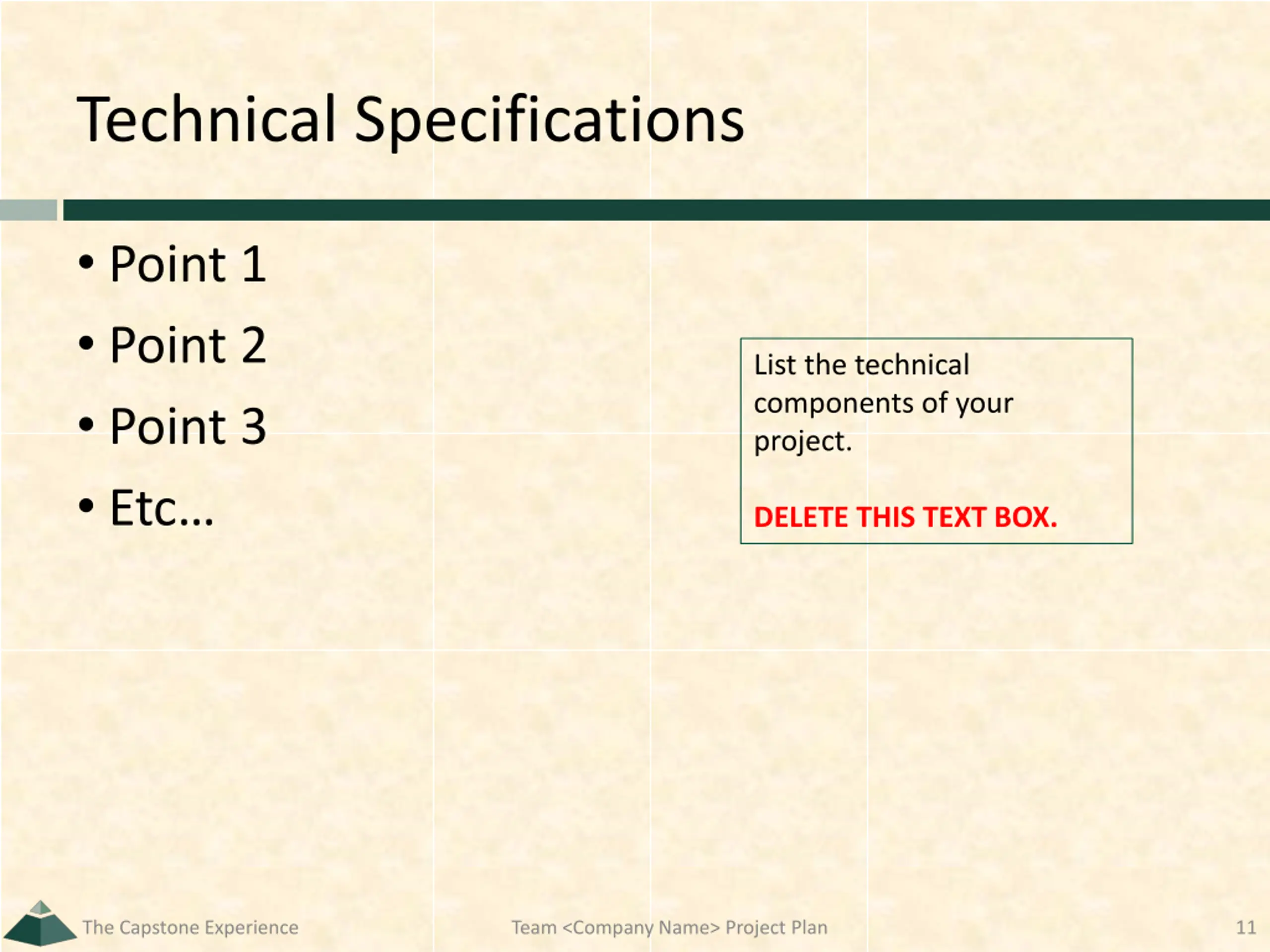 Technical Specifications Point 1 Point 2 Point 3 Etc List the technical components of your project. DELETE THIS TEXT BOX. The Capstone Experience Team <Company Name> Project Plan 11