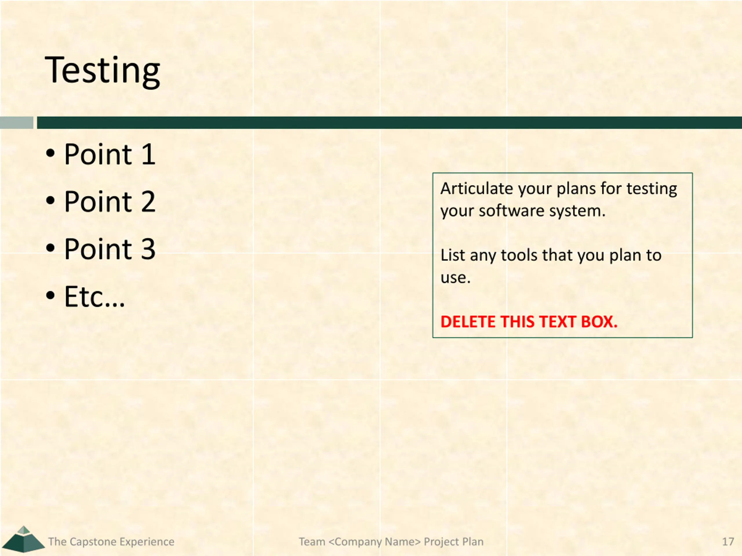 Testing Point 1 Point 2 Point 3 Etc Articulate your plans for testing your software system. List any tools that you plan to use. DELETE THIS TEXT BOX. The Capstone Experience Team <Company Name> Project Plan 17