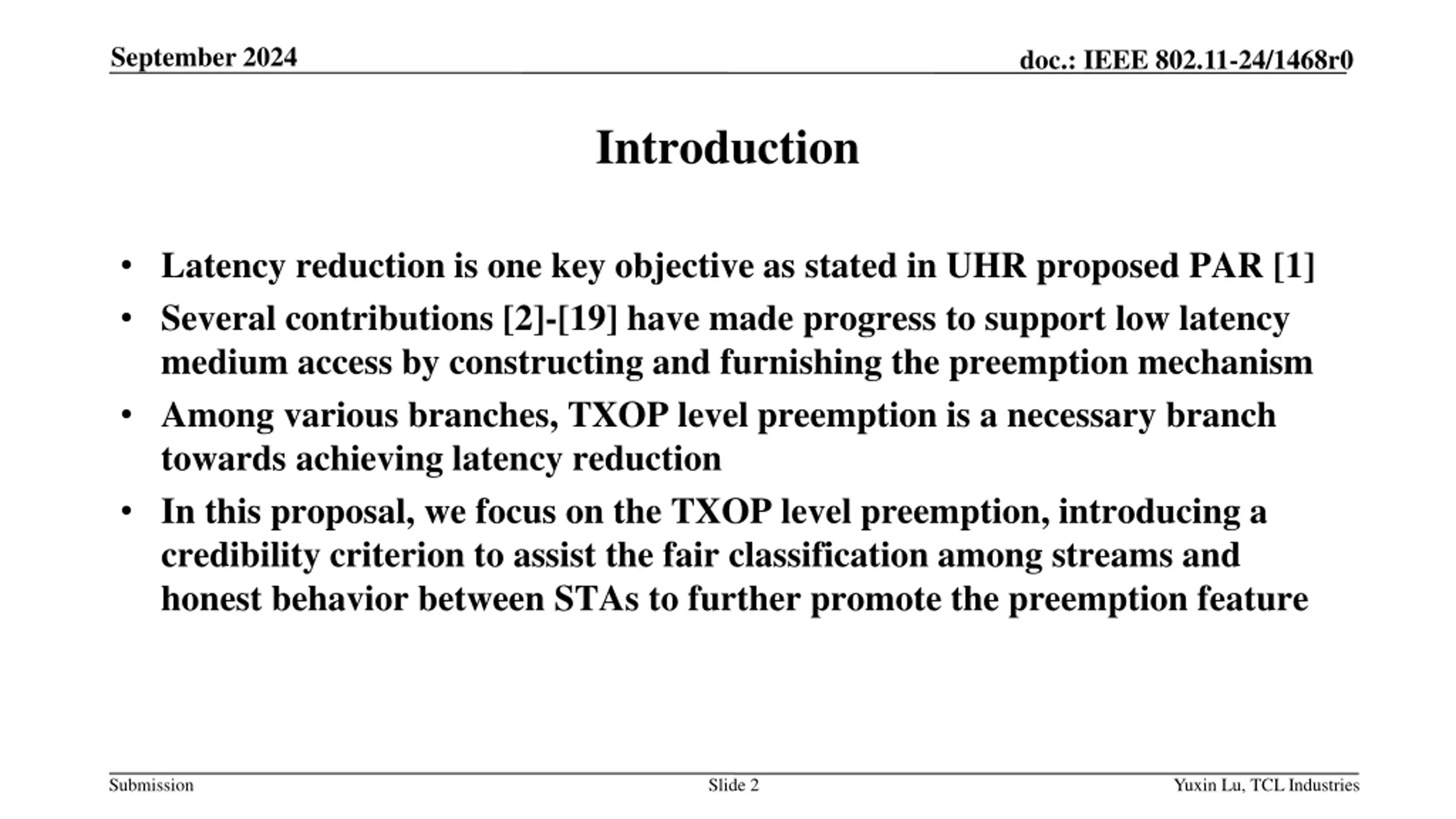 September 2024 doc.: IEEE 802.11-24/1468r0 Introduction Latency reduction is one key objective as stated in UHR proposed PAR [1] Several contributions [2]-[19] have made progress to support low latency medium access by constructing and furnishing the preemption mechanism Among various branches, TXOP level preemption is a necessary branch towards achieving latency reduction In this proposal, we focus on the TXOP level preemption, introducing a credibility criterion to assist the fair classification among streams and honest behavior between STAs to further promote the preemption feature Submission Slide 2 Yuxin Lu, TCL Industries