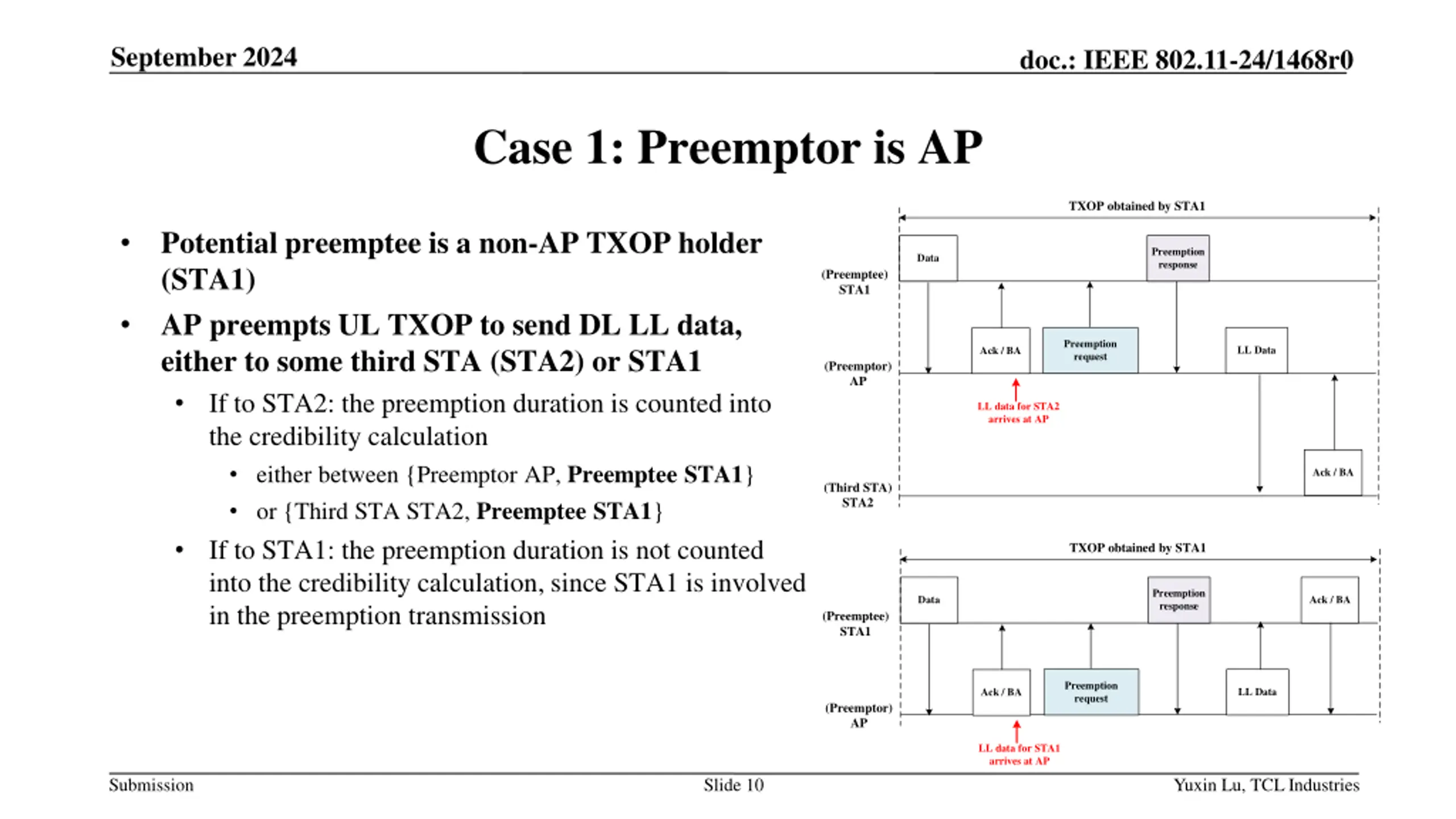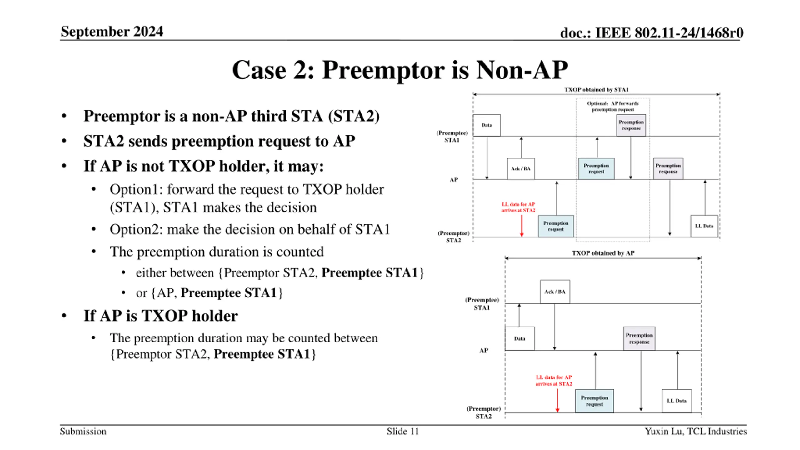September 2024 doc.: IEEE 802.11-24/1468r0 Case 1: Preemptor is AP TXOP obtained by STA1 Potential preemptee is a non-AP TXOP holder (STA1) AP preempts UL TXOP to send DL LL data, either to some third STA (STA2) or STA1 If to STA2: the preemption duration is counted into the credibility calculation either between {Preemptor AP, Preemptee STA1} or {Third STA STA2, Preemptee STA1} If to STA1: the preemption duration is not counted into the credibility calculation, since STA1 is involved in the preemption transmission Preemption response Data (Preemptee) STA1 Preemption request LL Data Ack / BA (Preemptor) AP LL data for STA2 arrives at AP Ack / BA (Third STA) STA2 TXOP obtained by STA1 Preemption response Data Ack / BA (Preemptee) STA1 Preemption request LL Data Ack / BA (Preemptor) AP LL data for STA1 arrives at AP Submission Slide 10 Yuxin Lu, TCL Industries