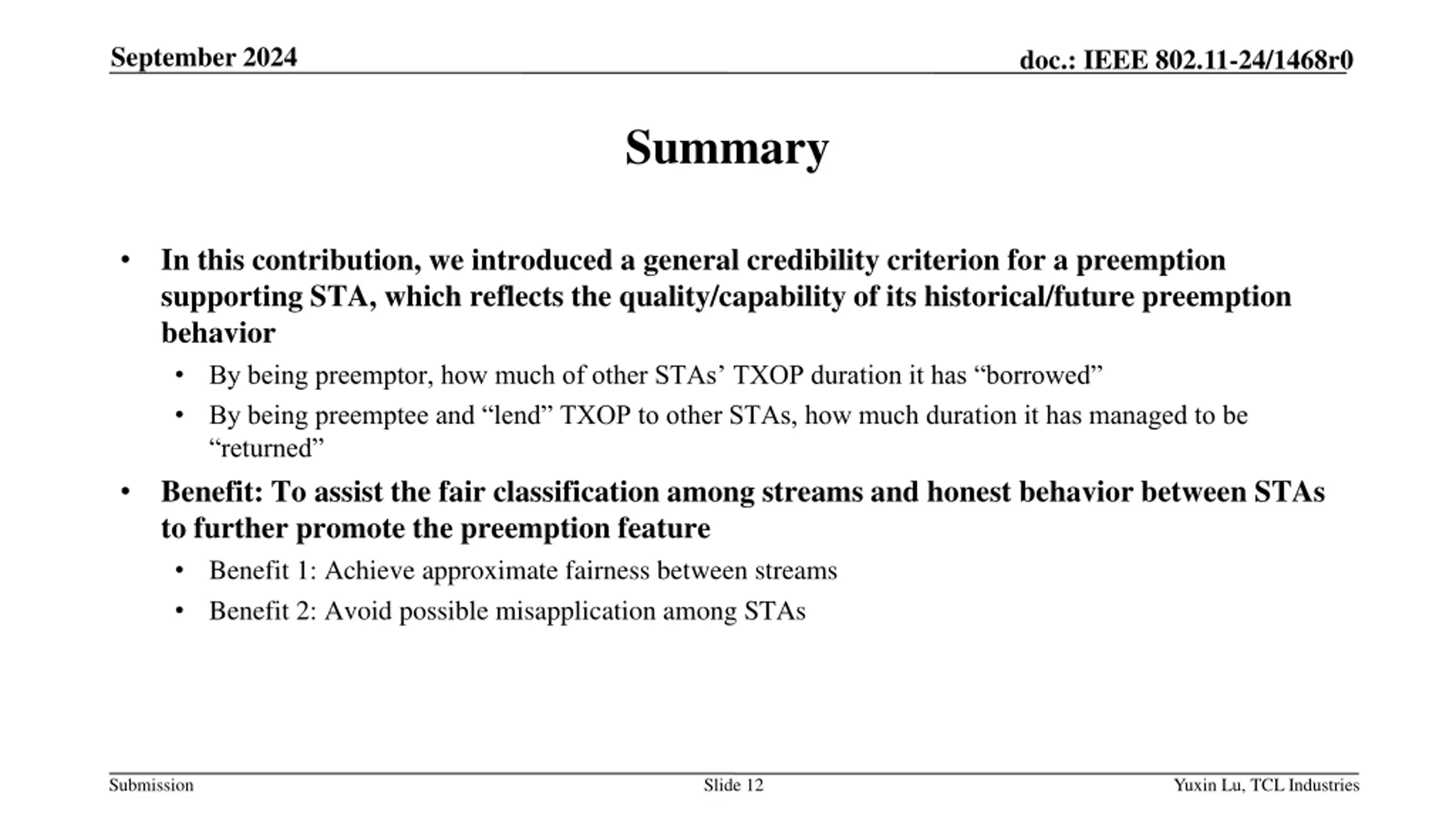 September 2024 doc.: IEEE 802.11-24/1468r0 Summary In this contribution, we introduced a general credibility criterion for a preemption supporting STA, which reflects the quality/capability of its historical/future preemption behavior By being preemptor, how much of other STAs TXOP duration it has borrowed By being preemptee and lend TXOP to other STAs, how much duration it has managed to be returned Benefit: To assist the fair classification among streams and honest behavior between STAs to further promote the preemption feature Benefit 1: Achieve approximate fairness between streams Benefit 2: Avoid possible misapplication among STAs Submission Slide 12 Yuxin Lu, TCL Industries