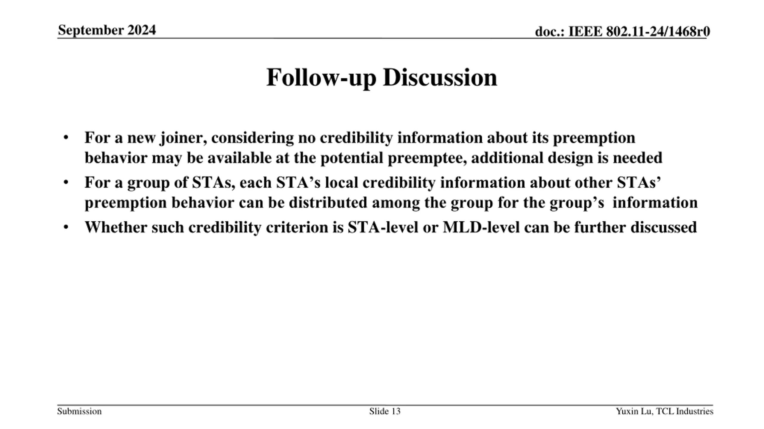 September 2024 doc.: IEEE 802.11-24/1468r0 Follow-up Discussion For a new joiner, considering no credibility information about its preemption behavior may be available at the potential preemptee, additional design is needed For a group of STAs, each STA s local credibility information about other STAs preemption behavior can be distributed among the group for the group s information Whether such credibility criterion is STA-level or MLD-level can be further discussed Submission Slide 13 Yuxin Lu, TCL Industries