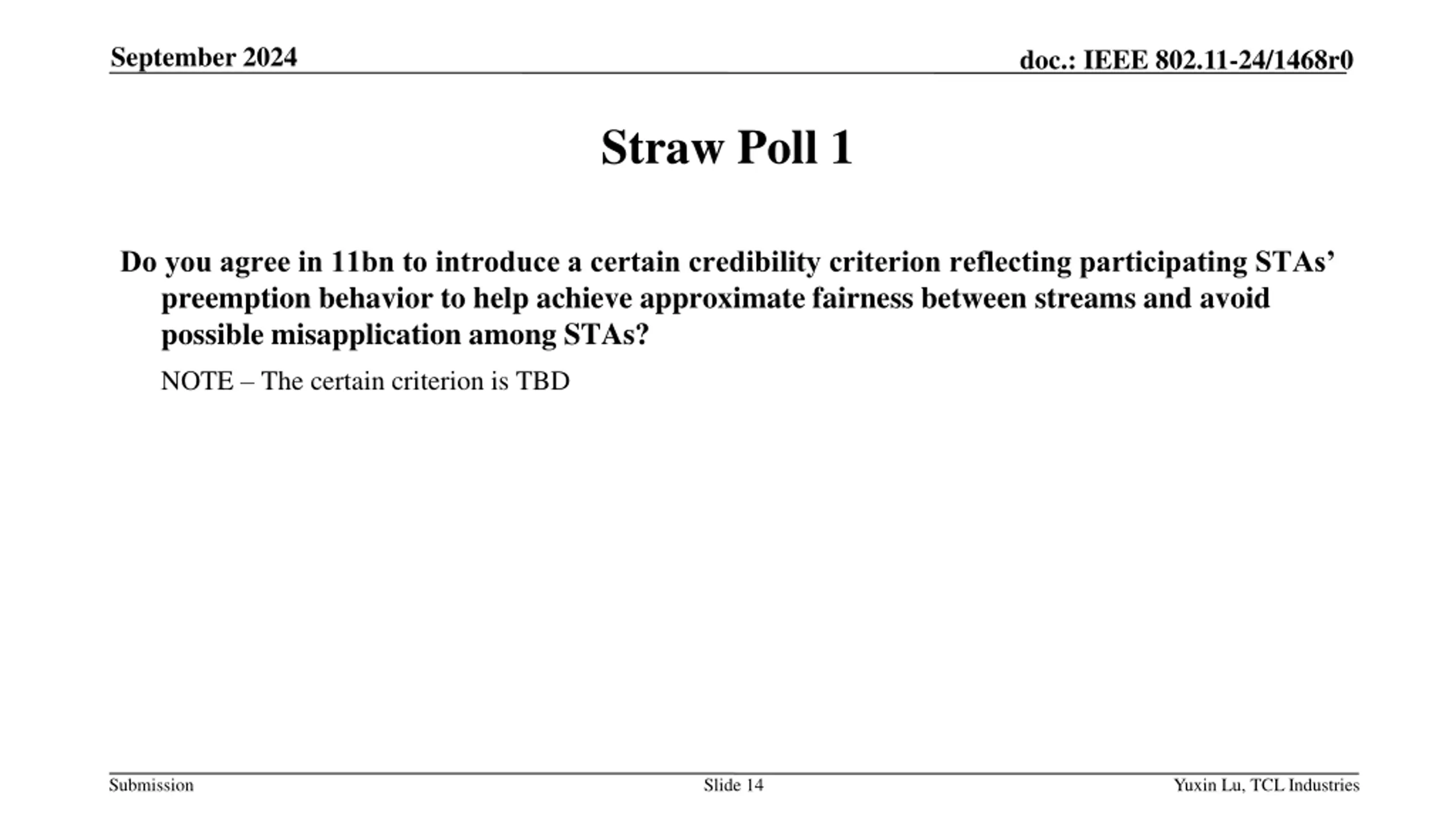 September 2024 doc.: IEEE 802.11-24/1468r0 Straw Poll 1 Do you agree in 11bn to introduce a certain credibility criterion reflecting participating STAs preemption behavior to help achieve approximate fairness between streams and avoid possible misapplication among STAs? NOTE The certain criterion is TBD Submission Slide 14 Yuxin Lu, TCL Industries