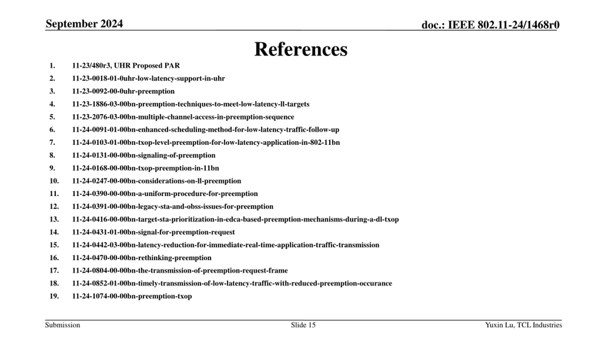 September 2024 doc.: IEEE 802.11-24/1468r0 References 1. 11-23/480r3, UHR Proposed PAR 2. 11-23-0018-01-0uhr-low-latency-support-in-uhr 3. 11-23-0092-00-0uhr-preemption 4. 11-23-1886-03-00bn-preemption-techniques-to-meet-low-latency-ll-targets 5. 11-23-2076-03-00bn-multiple-channel-access-in-preemption-sequence 6. 11-24-0091-01-00bn-enhanced-scheduling-method-for-low-latency-traffic-follow-up 7. 11-24-0103-01-00bn-txop-level-preemption-for-low-latency-application-in-802-11bn 8. 11-24-0131-00-00bn-signaling-of-preemption 9. 11-24-0168-00-00bn-txop-preemption-in-11bn 10. 11-24-0247-00-00bn-considerations-on-ll-preemption 11. 11-24-0390-00-00bn-a-uniform-procedure-for-preemption 12. 11-24-0391-00-00bn-legacy-sta-and-obss-issues-for-preemption 13. 11-24-0416-00-00bn-target-sta-prioritization-in-edca-based-preemption-mechanisms-during-a-dl-txop 14. 11-24-0431-01-00bn-signal-for-preemption-request 15. 11-24-0442-03-00bn-latency-reduction-for-immediate-real-time-application-traffic-transmission 16. 11-24-0470-00-00bn-rethinking-preemption 17. 11-24-0804-00-00bn-the-transmission-of-preemption-request-frame 18. 11-24-0852-01-00bn-timely-transmission-of-low-latency-traffic-with-reduced-preemption-occurance 19. 11-24-1074-00-00bn-preemption-txop Submission Slide 15 Yuxin Lu, TCL Industries