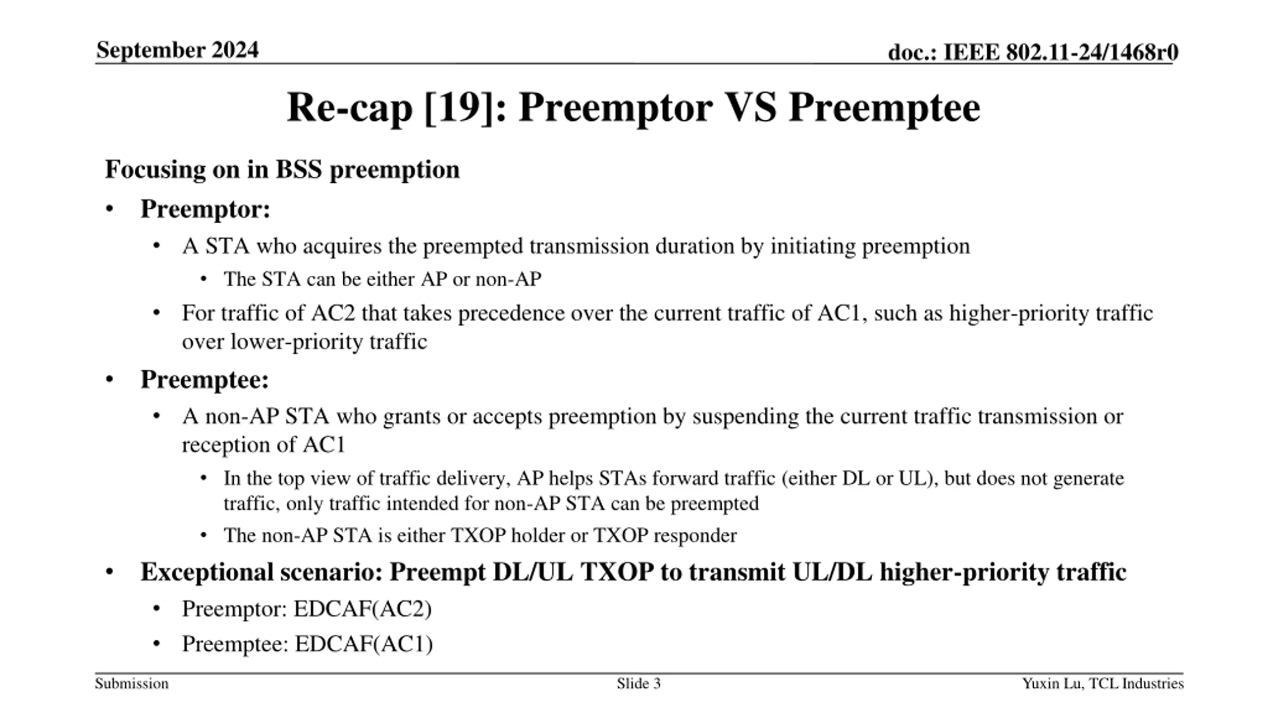September 2024 doc.: IEEE 802.11-24/1468r0 Re-cap [19]: Preemptor VS Preemptee Focusing on in BSS preemption Preemptor: A STA who acquires the preempted transmission duration by initiating preemption The STA can be either AP or non-AP For traffic of AC2 that takes precedence over the current traffic of AC1, such as higher-priority traffic over lower-priority traffic Preemptee: A non-AP STA who grants or accepts preemption by suspending the current traffic transmission or reception of AC1 In the top view of traffic delivery, AP helps STAs forward traffic (either DL or UL), but does not generate traffic, only traffic intended for non-AP STA can be preempted The non-AP STA is either TXOP holder or TXOP responder Exceptional scenario: Preempt DL/UL TXOP to transmit UL/DL higher-priority traffic Preemptor: EDCAF(AC2) Preemptee: EDCAF(AC1) Submission Slide 3 Yuxin Lu, TCL Industries