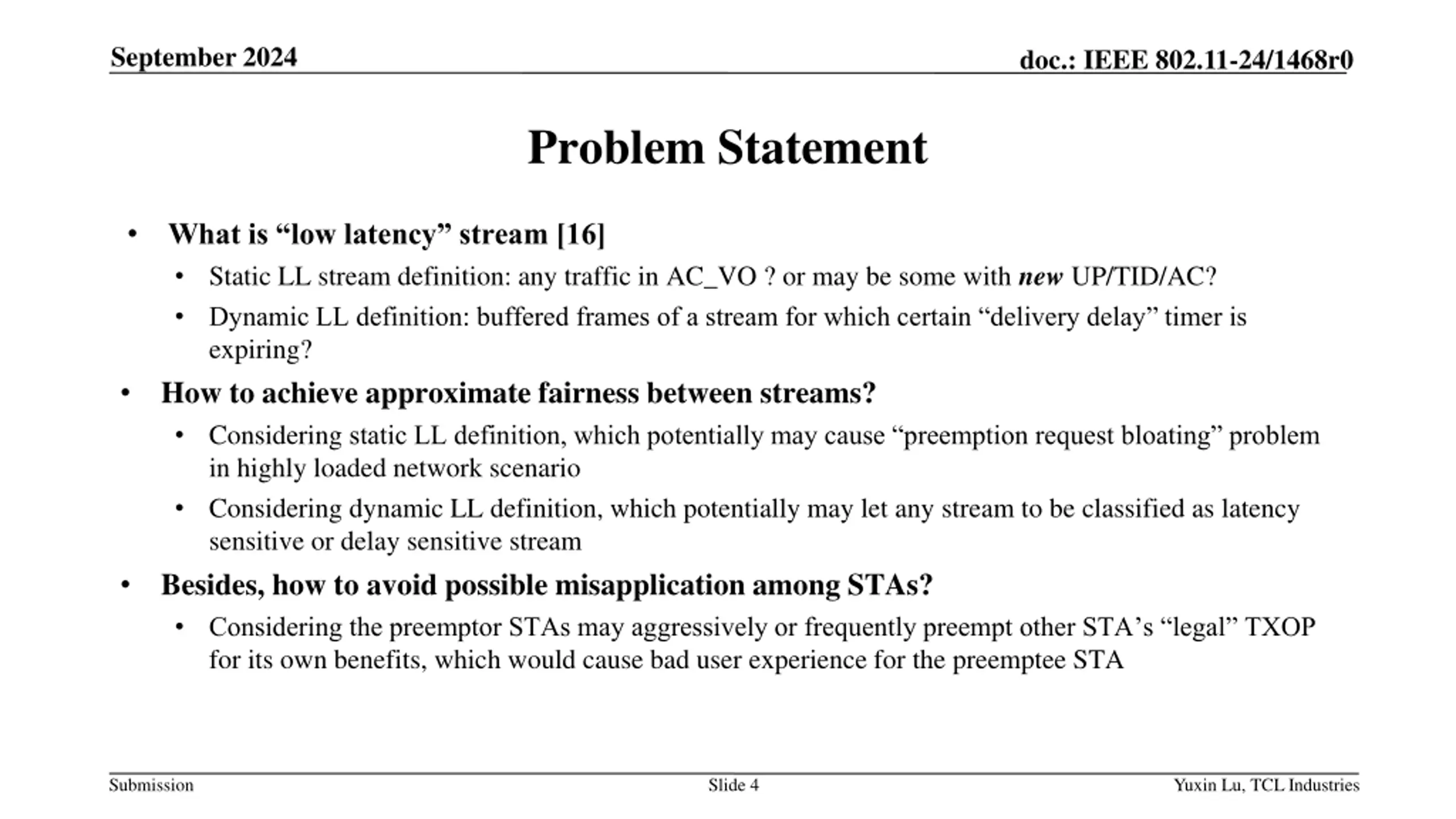 September 2024 doc.: IEEE 802.11-24/1468r0 Problem Statement What is low latency stream [16] Static LL stream definition: any traffic in AC_VO ? or may be some with newUP/TID/AC? Dynamic LL definition: buffered frames of a stream for which certain delivery delay timer is expiring? How to achieve approximate fairness between streams? Considering static LL definition, which potentially may cause preemption request bloating problem in highly loaded network scenario Considering dynamic LL definition, which potentially may let any stream to be classified as latency sensitive or delay sensitive stream Besides, how to avoid possible misapplication among STAs? Considering the preemptor STAs may aggressively or frequently preempt other STA s legal TXOP for its own benefits, which would cause bad user experience for the preemptee STA Submission Slide 4 Yuxin Lu, TCL Industries