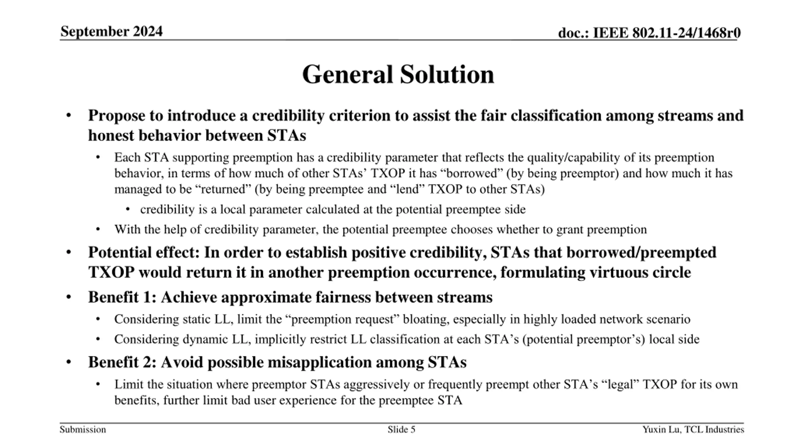 September 2024 doc.: IEEE 802.11-24/1468r0 General Solution Propose to introduce a credibility criterion to assist the fair classification among streams and honest behavior between STAs Each STA supporting preemption has a credibility parameter that reflects the quality/capability of its preemption behavior, in terms of how much of other STAs TXOP it has borrowed (by being preemptor) and how much it has managed to be returned (by being preemptee and lend TXOP to other STAs) credibility is a local parameter calculated at the potential preemptee side With the help of credibility parameter, the potential preemptee chooses whether to grant preemption Potential effect: In order to establish positive credibility, STAs that borrowed/preempted TXOP would return it in another preemption occurrence, formulating virtuous circle Benefit 1: Achieve approximate fairness between streams Considering static LL, limit the preemption request bloating, especially in highly loaded network scenario Considering dynamic LL, implicitly restrict LL classification at each STA s (potential preemptor s) local side Benefit 2: Avoid possible misapplication among STAs Limit the situation where preemptor STAs aggressively or frequently preempt other STA s legal TXOP for its own benefits, further limit bad user experience for the preemptee STA Submission Slide 5 Yuxin Lu, TCL Industries