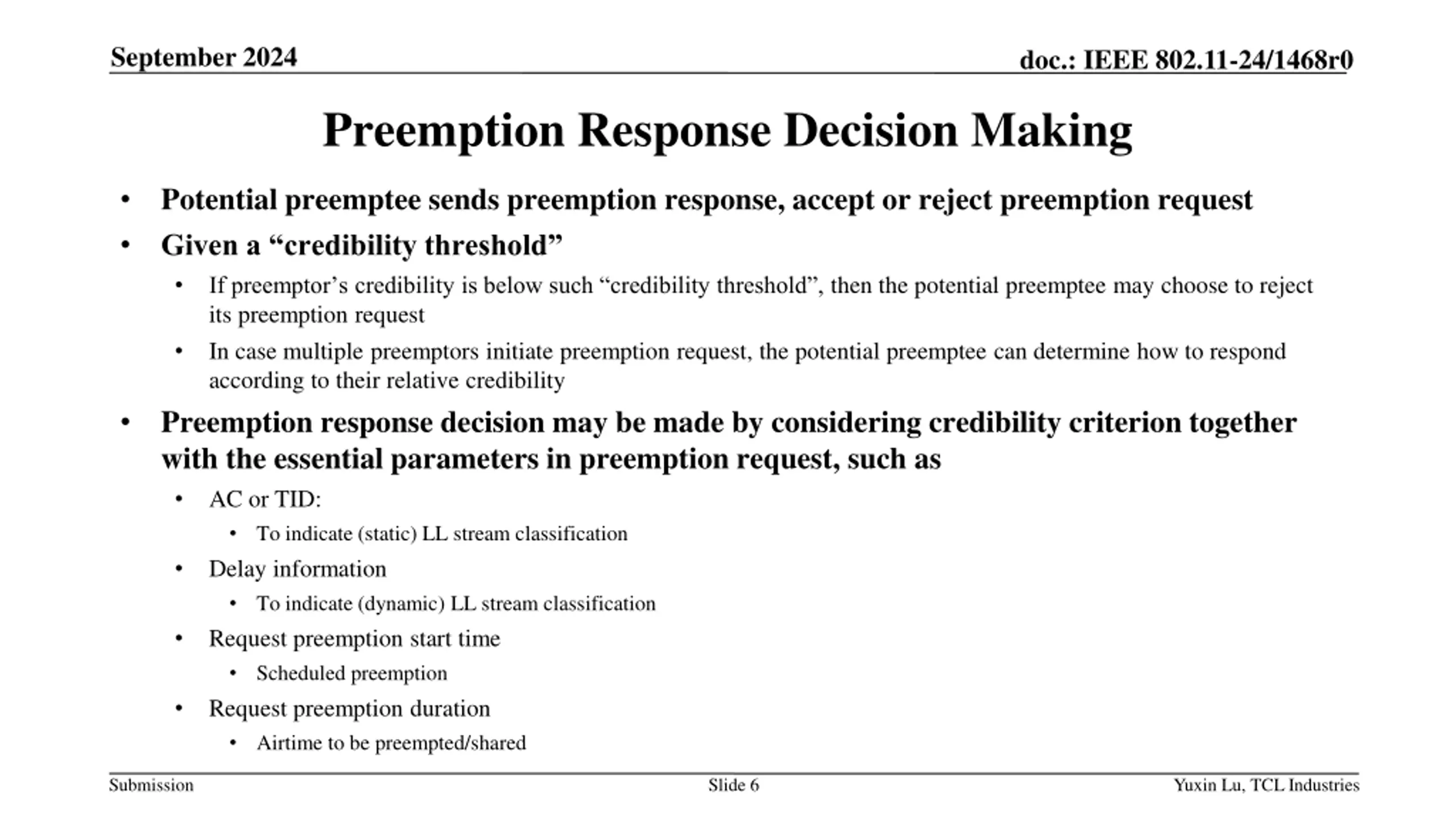 September 2024 doc.: IEEE 802.11-24/1468r0 Preemption Response Decision Making Potential preemptee sends preemption response, accept or reject preemption request Given a credibility threshold If preemptor s credibility is below such credibility threshold , then the potential preemptee may choose to reject its preemption request In case multiple preemptors initiate preemption request, the potential preemptee can determine how to respond according to their relative credibility Preemption response decision may be made by considering credibility criterion together with the essential parameters in preemption request, such as AC or TID: To indicate (static) LL stream classification Delay information To indicate (dynamic) LL stream classification Request preemption start time Scheduled preemption Request preemption duration Airtime to be preempted/shared Submission Slide 6 Yuxin Lu, TCL Industries