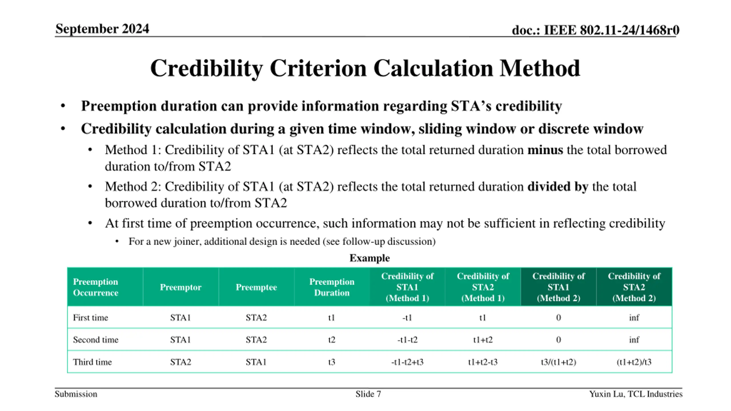September 2024 doc.: IEEE 802.11-24/1468r0 Credibility Criterion Calculation Method Preemption duration can provide information regarding STA s credibility Credibility calculation during a given time window, sliding window or discrete window Method 1: Credibility of STA1 (at STA2) reflects the total returned duration minus the total borrowed duration to/from STA2 Method 2: Credibility of STA1 (at STA2) reflects the total returned duration divided by the total borrowed duration to/from STA2 At first time of preemption occurrence, such information may not be sufficient in reflecting credibility For a new joiner, additional design is needed (see follow-up discussion) Example Credibility of STA1 (Method 1) Credibility of STA2 (Method 1) Credibility of STA1 (Method 2) Credibility of STA2 (Method 2) Preemption Occurrence Preemption Duration Preemptor Preemptee First time STA1 STA2 t1 -t1 t1 0 inf Second time STA1 STA2 t2 -t1-t2 t1+t2 0 inf Third time STA2 STA1 t3 -t1-t2+t3 t1+t2-t3 t3/(t1+t2) (t1+t2)/t3 Submission Slide 7 Yuxin Lu, TCL Industries