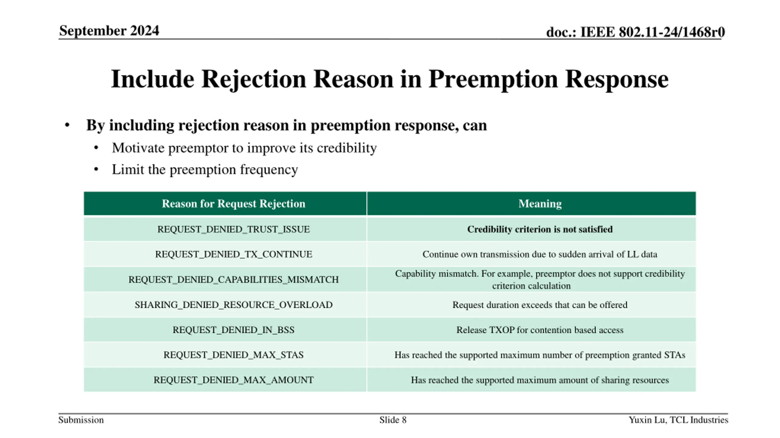 September 2024 doc.: IEEE 802.11-24/1468r0 Include Rejection Reason in Preemption Response By including rejection reason in preemption response, can Motivate preemptor to improve its credibility Limit the preemption frequency Reason for Request Rejection Meaning Credibility criterion is not satisfied REQUEST_DENIED_TRUST_ISSUE REQUEST_DENIED_TX_CONTINUE Continue own transmission due to sudden arrival of LL data Capability mismatch. For example, preemptor does not support credibility criterion calculation REQUEST_DENIED_CAPABILITIES_MISMATCH SHARING_DENIED_RESOURCE_OVERLOAD Request duration exceeds that can be offered REQUEST_DENIED_IN_BSS Release TXOP for contention based access REQUEST_DENIED_MAX_STAS Has reached the supported maximum number of preemption granted STAs REQUEST_DENIED_MAX_AMOUNT Has reached the supported maximum amount of sharing resources Submission Slide 8 Yuxin Lu, TCL Industries