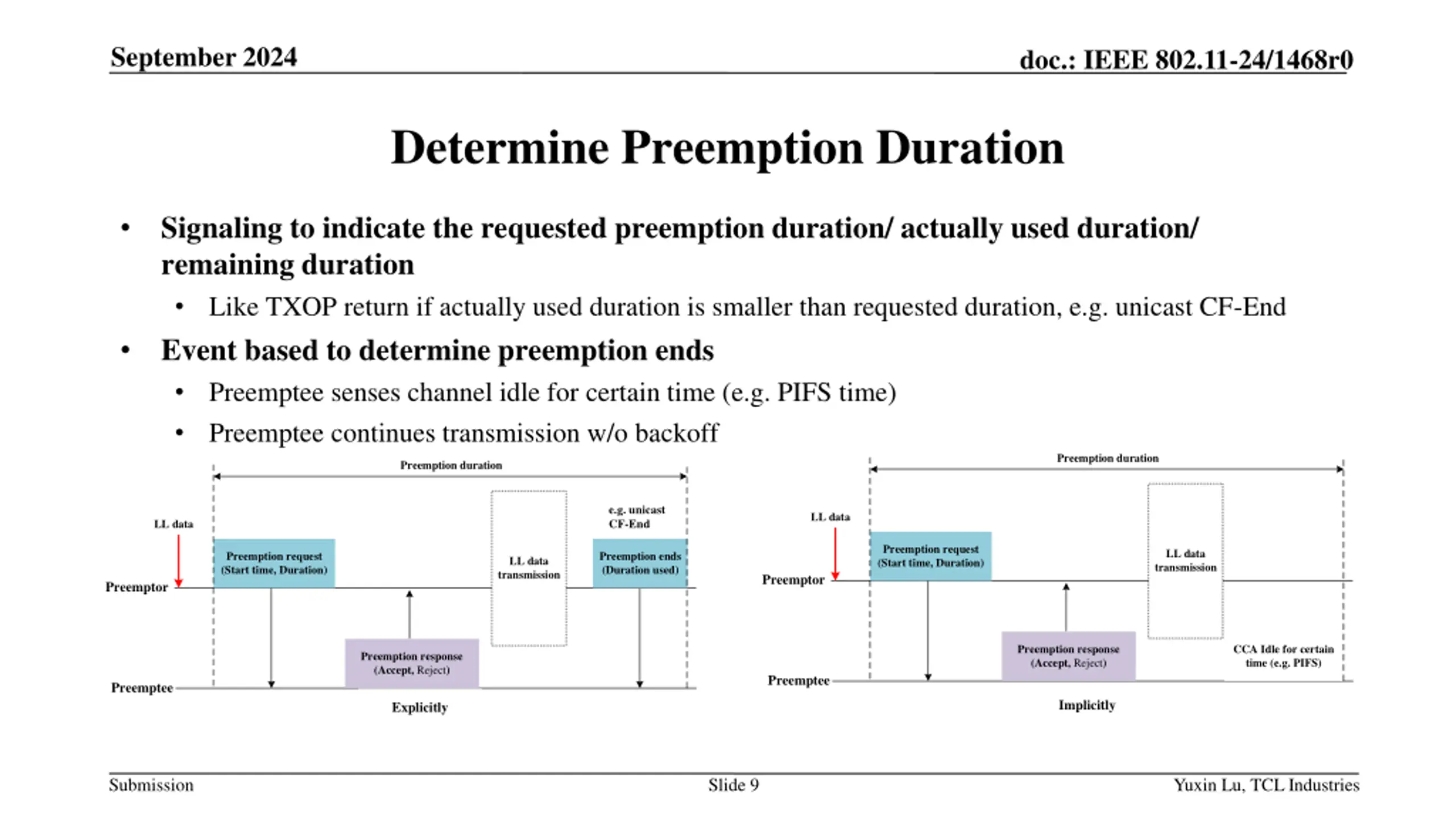 September 2024 doc.: IEEE 802.11-24/1468r0 Determine Preemption Duration Signaling to indicate the requested preemption duration/ actually used duration/ remaining duration Like TXOP return if actually used duration is smaller than requested duration, e.g. unicast CF-End Event based to determine preemption ends Preemptee senses channel idle for certain time (e.g. PIFS time) Preemptee continues transmission w/o backoff Preemption duration Preemption duration e.g. unicast CF-End LL data LL data Preemption request (Start time, Duration) LL data transmission Preemption ends (Duration used) Preemption request (Start time, Duration) LL data transmission Preemptor Preemptor Preemption response (Accept, Reject) CCA Idle for certain time (e.g. PIFS) Preemption response (Accept, Reject) Preemptee Preemptee Implicitly Explicitly Submission Slide 9 Yuxin Lu, TCL Industries