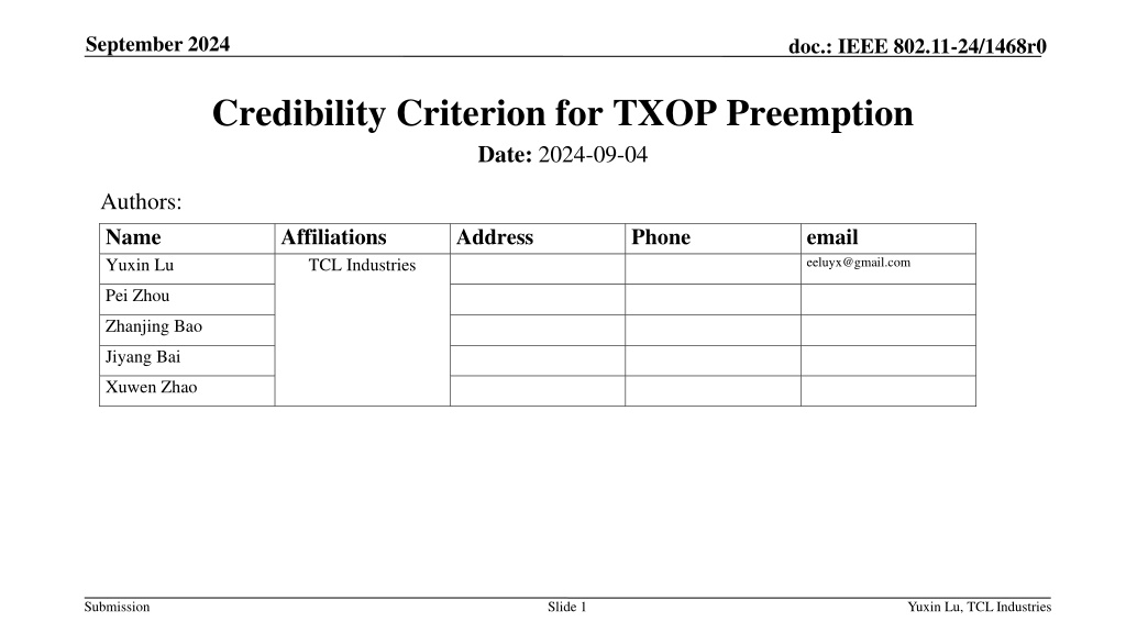 September 2024 doc.: IEEE 802.11-24/1468r0 Credibility Criterion for TXOP Preemption Date: 2024-09-04 Authors: Name Yuxin Lu Affiliations TCL Industries Address Phone email eeluyx@gmail.com Pei Zhou Zhanjing Bao Jiyang Bai Xuwen Zhao Submission Slide 1 Yuxin Lu, TCL Industries