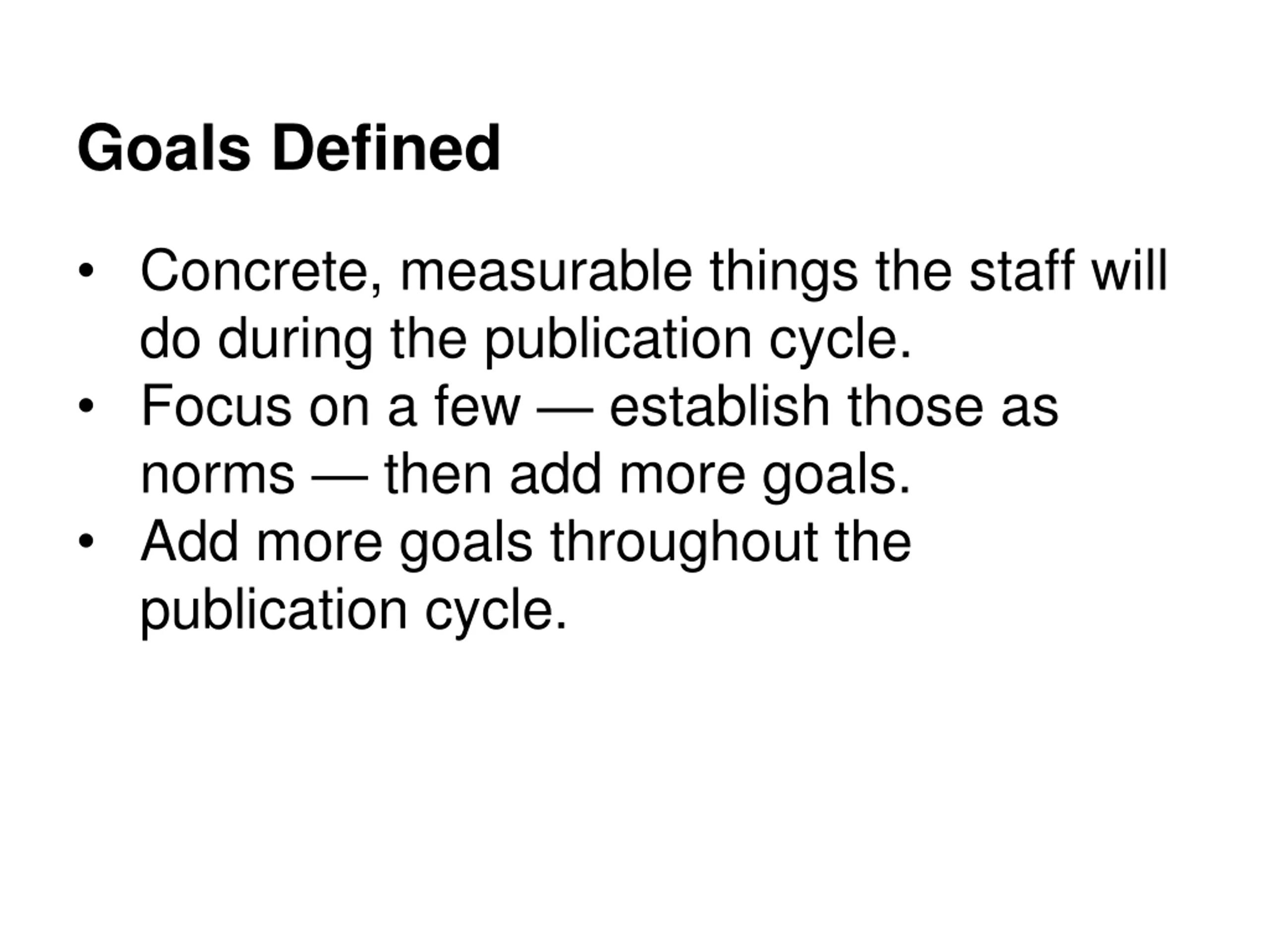 Goals Defined Concrete, measurable things the staff will do during the publication cycle. Focus on a few establish those as norms then add more goals. Add more goals throughout the publication cycle.