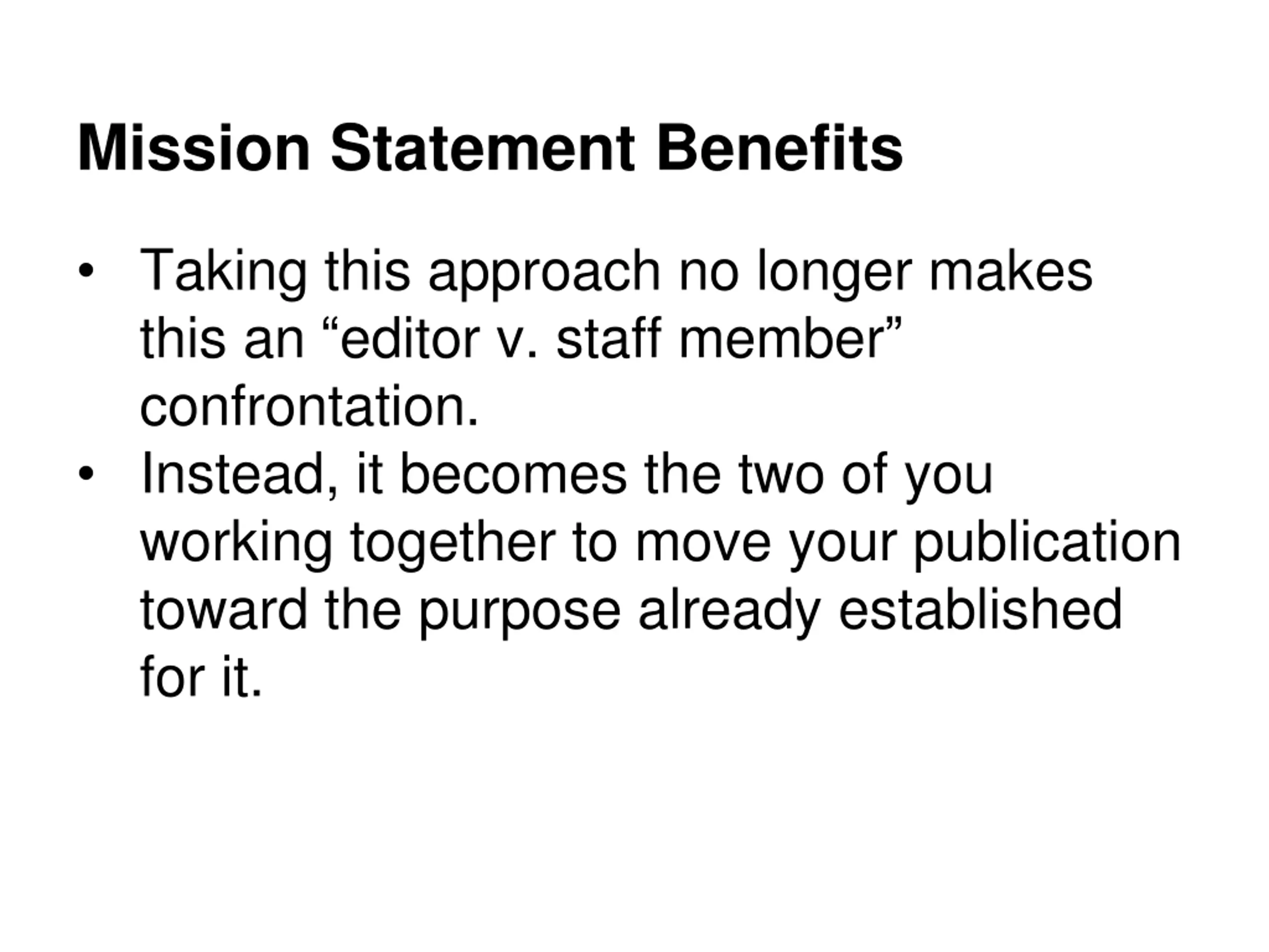 Mission Statement Benefits Taking this approach no longer makes this an editor v. staff member confrontation. Instead, it becomes the two of you working together to move your publication toward the purpose already established for it.