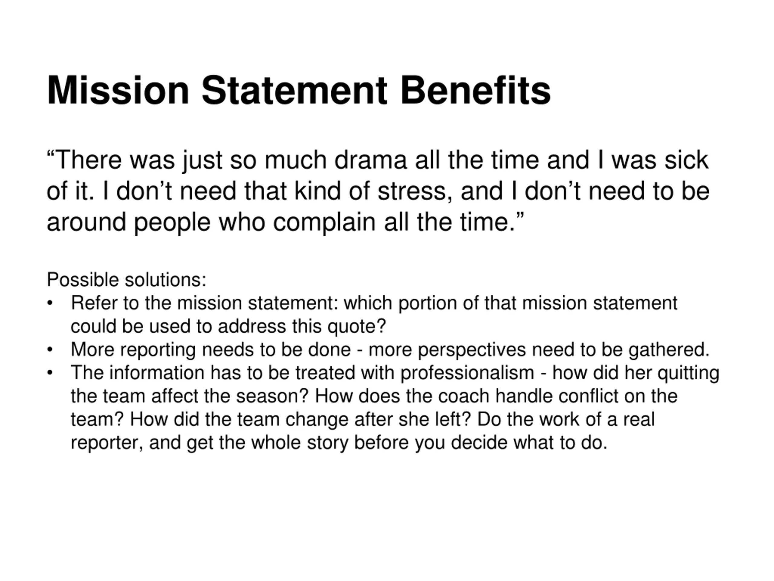 Mission Statement Benefits There was just so much drama all the time and I was sick of it. I don t need that kind of stress, and I don t need to be around people who complain all the time. Possible solutions: Refer to the mission statement: which portion of that mission statement could be used to address this quote? More reporting needs to be done - more perspectives need to be gathered. The information has to be treated with professionalism - how did her quitting the team affect the season? How does the coach handle conflict on the team? How did the team change after she left? Do the work of a real reporter, and get the whole story before you decide what to do.