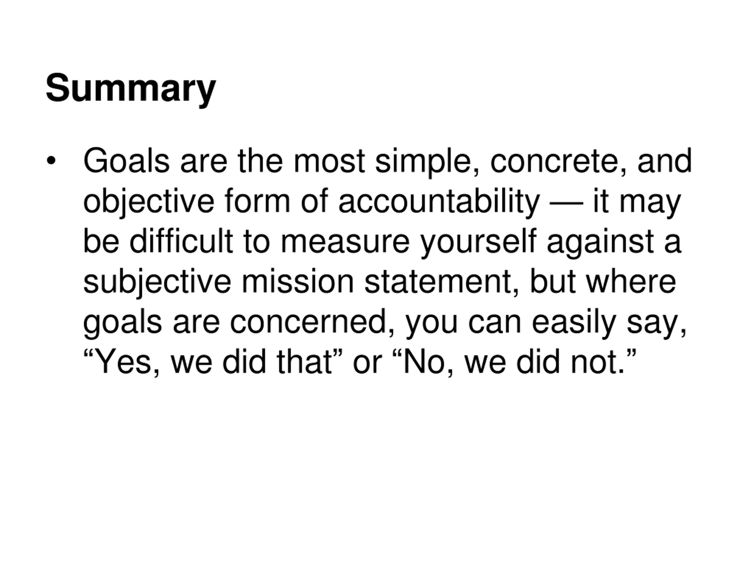 Summary Goals are the most simple, concrete, and objective form of accountability it may be difficult to measure yourself against a subjective mission statement, but where goals are concerned, you can easily say, Yes, we did that or No, we did not.