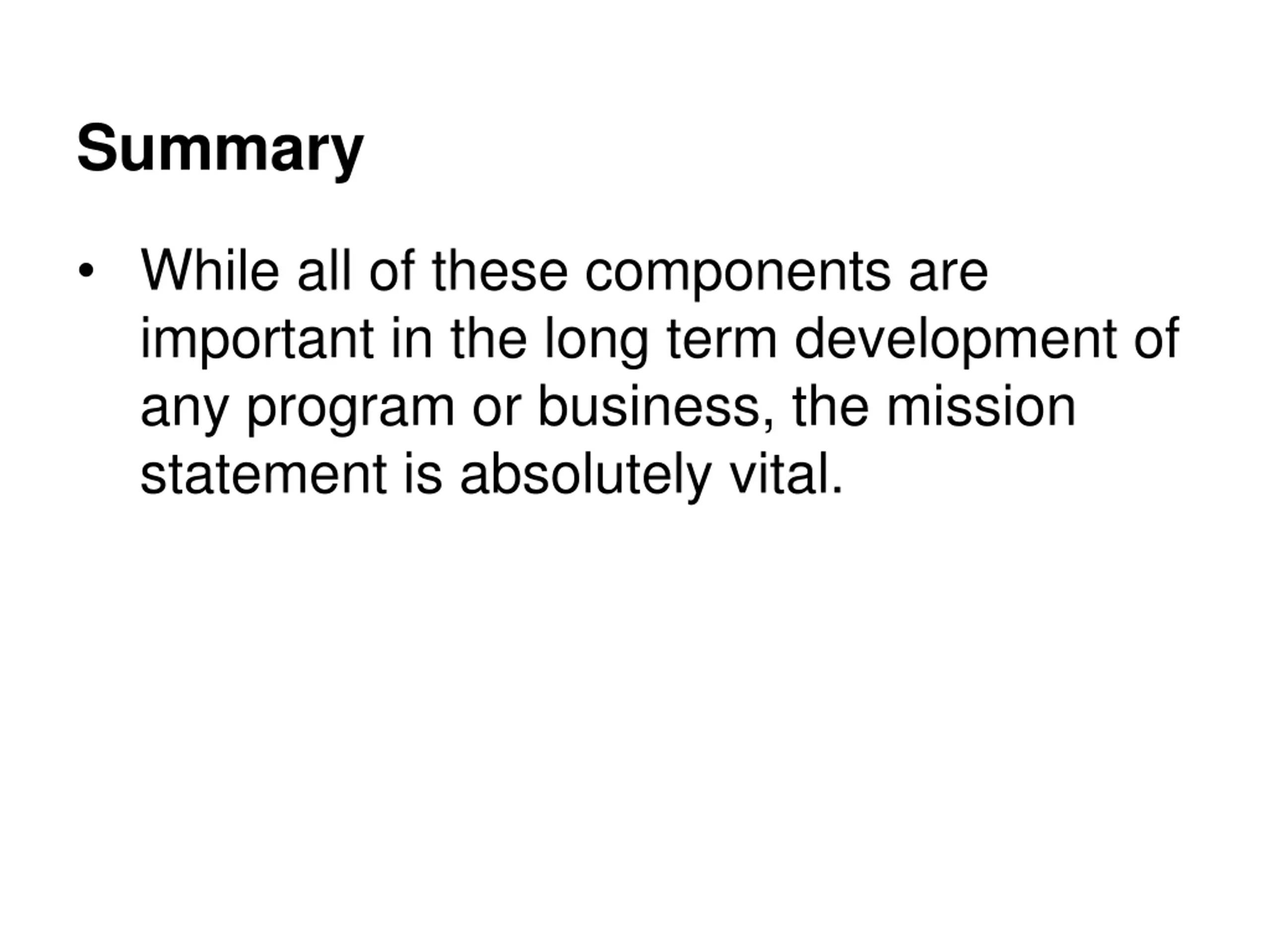 Summary While all of these components are important in the long term development of any program or business, the mission statement is absolutely vital.