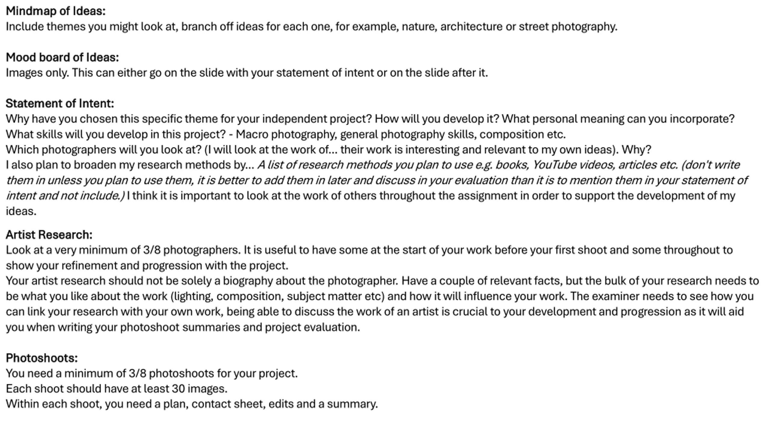 Mindmap of Ideas: Mindmap of Ideas: Include themes you might look at, branch off ideas for each one, for example, nature, architecture or street photography. Mood board of Ideas: Mood board of Ideas: Images only. This can either go on the slide with your statement of intent or on the slide after it. Statement of Intent: Statement of Intent: Why have you chosen this specific theme for your independent project? How will you develop it? What personal meaning can you incorporate? What skills will you develop in this project? - Macro photography, general photography skills, composition etc. Which photographers will you look at? (I will look at the work of... their work is interesting and relevant to my own ideas). Why? I also plan to broaden my research methods by... A list of research methods you plan to use e.g. books, YouTube videos, articles etc. (don't write them in unless you plan to use them, it is better to add them in later and discuss in your evaluation than it is to mention them in your statement of intent and not include.) I think it is important to look at the work of others throughout the assignment in order to support the development of my ideas. Artist Research: Artist Research: Look at a very minimum of 3/8 photographers. It is useful to have some at the start of your work before your first shoot and some throughout to show your refinement and progression with the project. Your artist research should not be solely a biography about the photographer. Have a couple of relevant facts, but the bulk of your research needs to be what you like about the work (lighting, composition, subject matter etc) and how it will influence your work. The examiner needs to see how you can link your research with your own work, being able to discuss the work of an artist is crucial to your development and progression as it will aid you when writing your photoshoot summaries and project evaluation. Photoshoots: Photoshoots: You need a minimum of 3/8 photoshoots for your project. Each shoot should have at least 30 images. Within each shoot, you need a plan, contact sheet, edits and a summary.