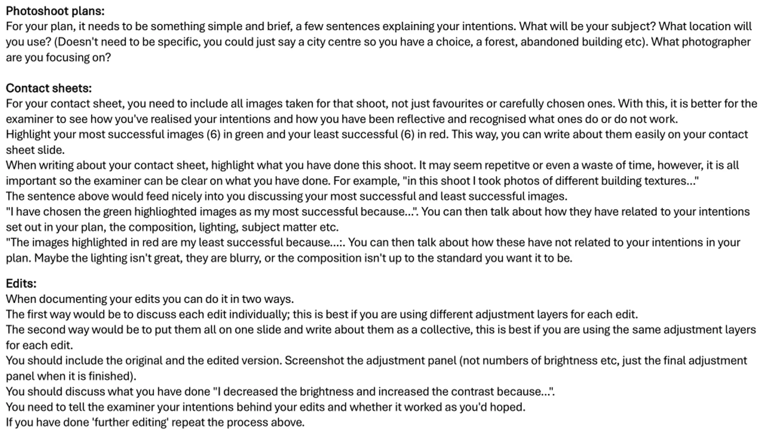 Photoshoot plans: Photoshoot plans: For your plan, it needs to be something simple and brief, a few sentences explaining your intentions. What will be your subject? What location will you use? (Doesn't need to be specific, you could just say a city centre so you have a choice, a forest, abandoned building etc). What photographer are you focusing on? Contact sheets: Contact sheets: For your contact sheet, you need to include all images taken for that shoot, not just favourites or carefully chosen ones. With this, it is better for the examiner to see how you've realised your intentions and how you have been reflective and recognised what ones do or do not work. Highlight your most successful images (6) in green and your least successful (6) in red. This way, you can write about them easily on your contact sheet slide. When writing about your contact sheet, highlight what you have done this shoot. It may seem repetitve or even a waste of time, however, it is all important so the examiner can be clear on what you have done. For example, "in this shoot I took photos of different building textures..." The sentence above would feed nicely into you discussing your most successful and least successful images. "I have chosen the green highlioghted images as my most successful because...". You can then talk about how they have related to your intentions set out in your plan, the composition, lighting, subject matter etc. "The images highlighted in red are my least successful because...:. You can then talk about how these have not related to your intentions in your plan. Maybe the lighting isn't great, they are blurry, or the composition isn't up to the standard you want it to be. Edits: Edits: When documenting your edits you can do it in two ways. The first way would be to discuss each edit individually; this is best if you are using different adjustment layers for each edit. The second way would be to put them all on one slide and write about them as a collective, this is best if you are using the same adjustment layers for each edit. You should include the original and the edited version. Screenshot the adjustment panel (not numbers of brightness etc, just the final adjustment panel when it is finished). You should discuss what you have done "I decreased the brightness and increased the contrast because...". You need to tell the examiner your intentions behind your edits and whether it worked as you'd hoped. If you have done 'further editing' repeat the process above.