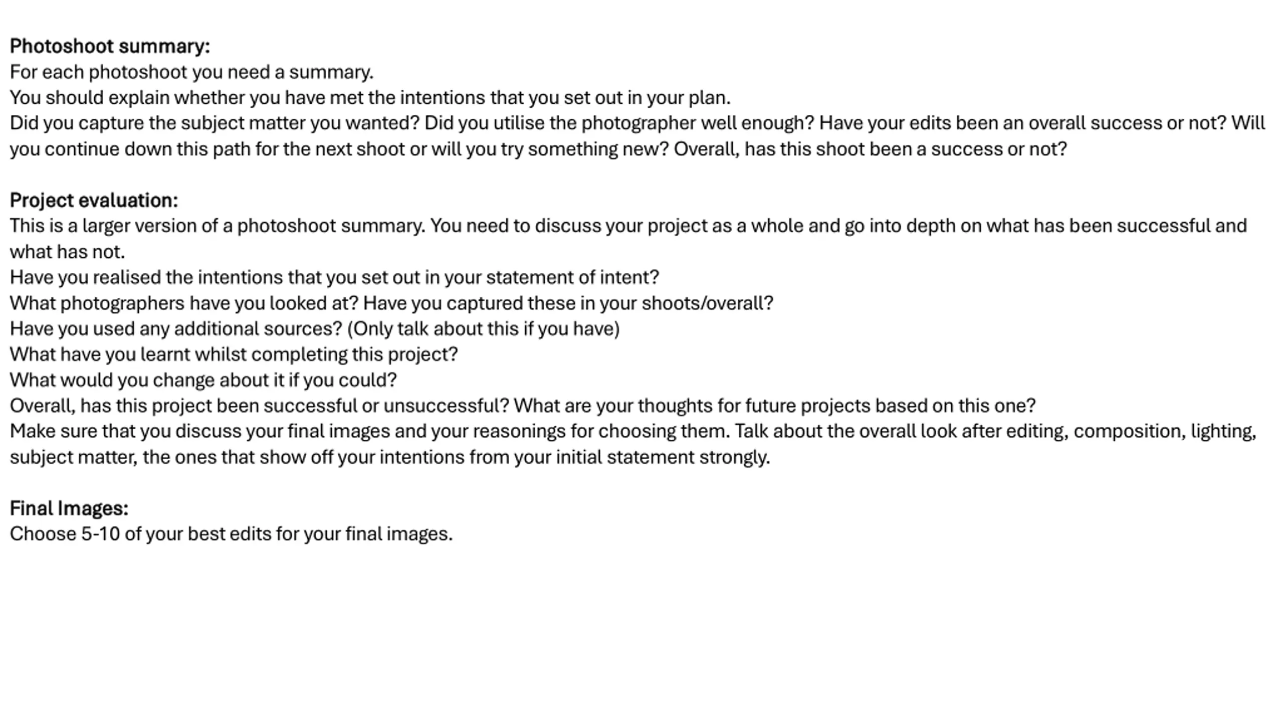 Photoshoot summary: Photoshoot summary: For each photoshoot you need a summary. You should explain whether you have met the intentions that you set out in your plan. Did you capture the subject matter you wanted? Did you utilise the photographer well enough? Have your edits been an overall success or not? Will you continue down this path for the next shoot or will you try something new? Overall, has this shoot been a success or not? Project evaluation: Project evaluation: This is a larger version of a photoshoot summary. You need to discuss your project as a whole and go into depth on what has been successful and what has not. Have you realised the intentions that you set out in your statement of intent? What photographers have you looked at? Have you captured these in your shoots/overall? Have you used any additional sources? (Only talk about this if you have) What have you learnt whilst completing this project? What would you change about it if you could? Overall, has this project been successful or unsuccessful? What are your thoughts for future projects based on this one? Make sure that you discuss your final images and your reasonings for choosing them. Talk about the overall look after editing, composition, lighting, subject matter, the ones that show off your intentions from your initial statement strongly. Final Images: Final Images: Choose 5-10 of your best edits for your final images.
