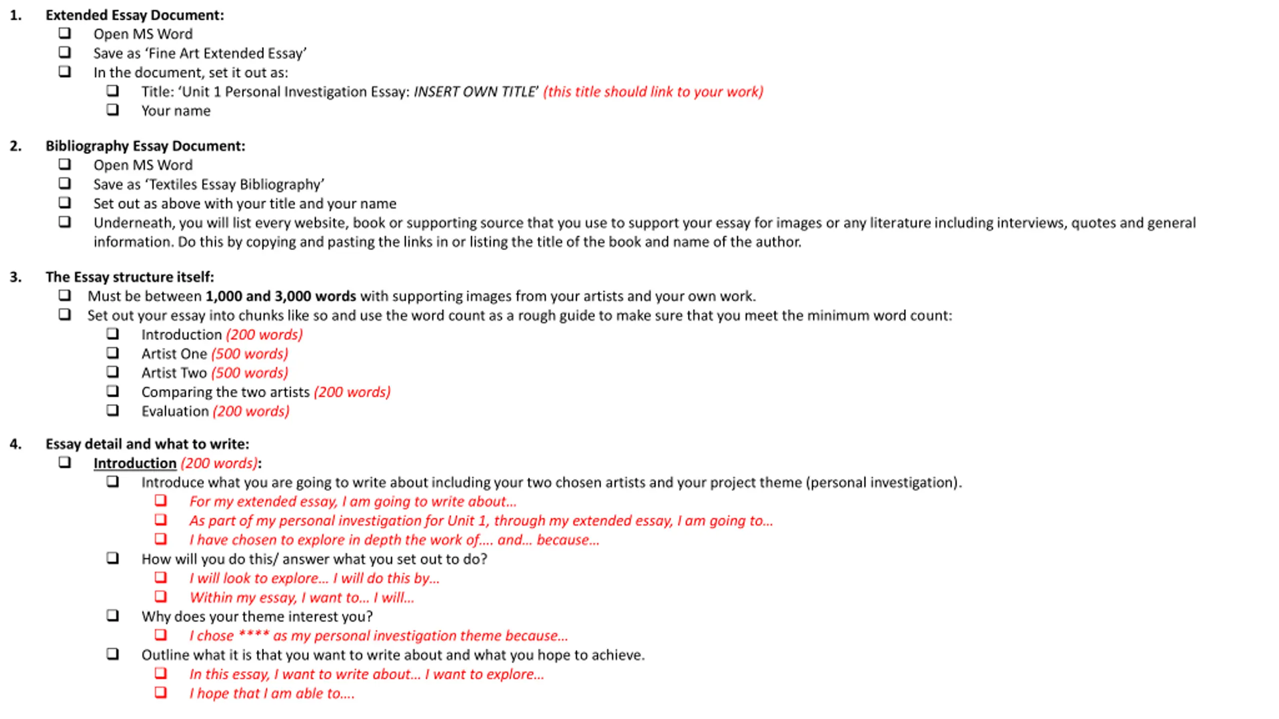 1. Extended Essay Document: q Open MS Word q Save as Fine Art Extended Essay q In the document, set it out as: q Title: Unit 1 Personal Investigation Essay: INSERT OWN TITLE (this title should link to your work) q Your name 2. Bibliography Essay Document: q Open MS Word q Save as Textiles Essay Bibliography q Set out as above with your title and your name q Underneath, you will list every website, book or supporting source that you use to support your essay for images or any literature including interviews, quotes and general information. Do this by copying and pasting the links in or listing the title of the book and name of the author. 3. The Essay structure itself: q Must be between 1,000 and 3,000 words with supporting images from your artists and your own work. q Set out your essay into chunks like so and use the word count as a rough guide to make sure that you meet the minimum word count: q Introduction (200 words) q Artist One (500 words) q Artist Two (500 words) q Comparing the two artists (200 words) q Evaluation (200 words) 4. Essay detail and what to write: q Introduction (200 words): q Introduce what you are going to write about including your two chosen artists and your project theme (personal investigation). q For my extended essay, I am going to write about q As part of my personal investigation for Unit 1, through my extended essay, I am going to q I have chosen to explore in depth the work of . and because q How will you do this/ answer what you set out to do? q I will look to explore I will do this by q Within my essay, I want to I will q Why does your theme interest you? q I chose **** as my personal investigation theme because q Outline what it is that you want to write about and what you hope to achieve. q In this essay, I want to write about I want to explore q I hope that I am able to .