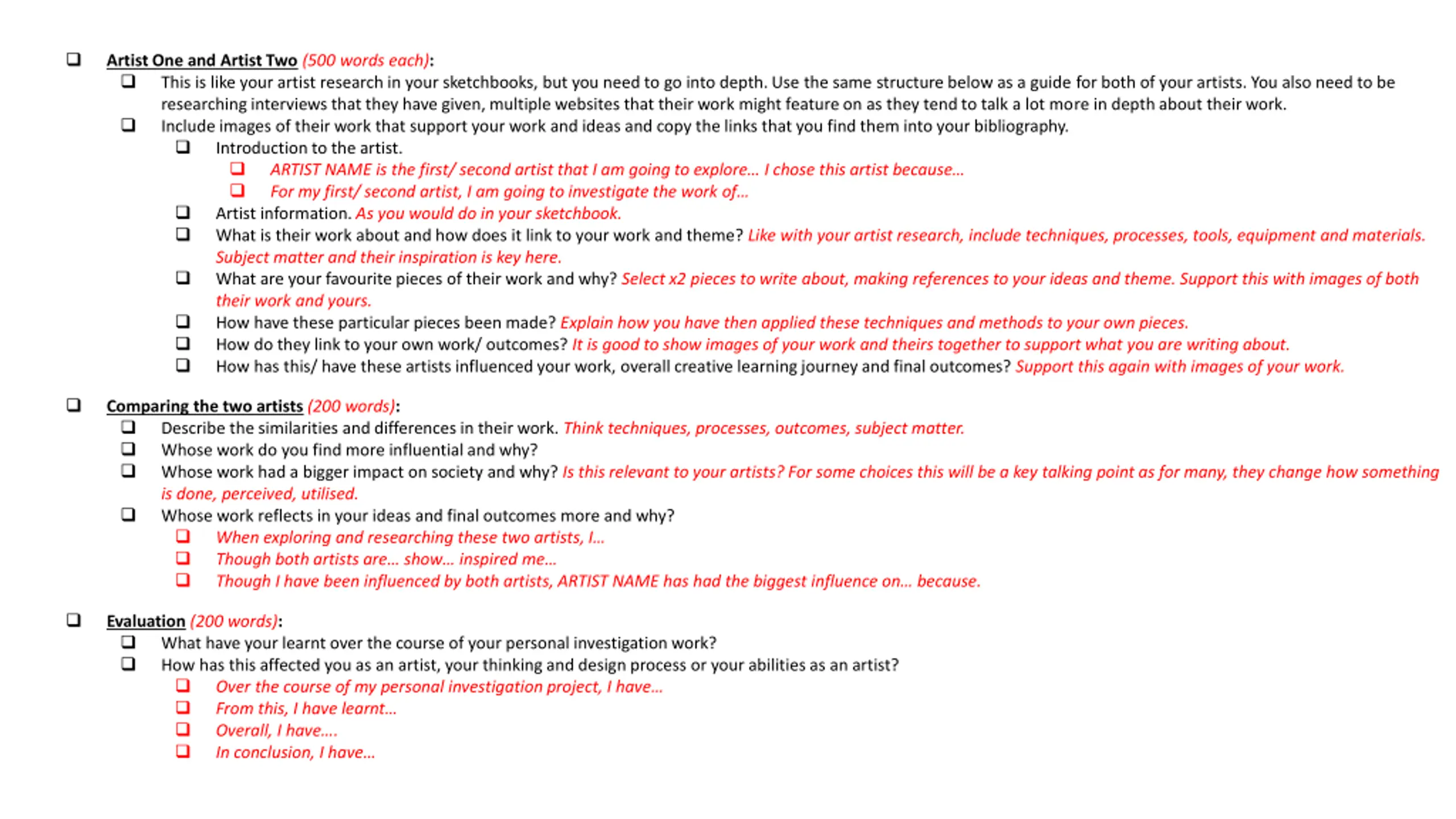 q Artist One and Artist Two (500 words each): q This is like your artist research in your sketchbooks, but you need to go into depth. Use the same structure below as a guide for both of your artists. You also need to be researching interviews that they have given, multiple websites that their work might feature on as they tend to talk a lot more in depth about their work. q Include images of their work that support your work and ideas and copy the links that you find them into your bibliography. q Introduction to the artist. q ARTIST NAME is the first/ second artist that I am going to explore I chose this artist because q For my first/ second artist, I am going to investigate the work of q Artist information. As you would do in your sketchbook. q What is their work about and how does it link to your work and theme? Like with your artist research, include techniques, processes, tools, equipment and materials. Subject matter and their inspiration is key here. q What are your favourite pieces of their work and why? Select x2 pieces to write about, making references to your ideas and theme. Support this with images of both their work and yours. q How have these particular pieces been made? Explain how you have then applied these techniques and methods to your own pieces. q How do they link to your own work/ outcomes? It is good to show images of your work and theirs together to support what you are writing about. q How has this/ have these artists influenced your work, overall creative learning journey and final outcomes? Support this again with images of your work. q Comparing the two artists (200 words): q Describe the similarities and differences in their work. Think techniques, processes, outcomes, subject matter. q Whose work do you find more influential and why? q Whose work had a bigger impact on society and why? Is this relevant to your artists? For some choices this will be a key talking point as for many, they change how something is done, perceived, utilised. q Whose work reflects in your ideas and final outcomes more and why? q When exploring and researching these two artists, I q Though both artists are show inspired me q Though I have been influenced by both artists, ARTIST NAME has had the biggest influence on because. q Evaluation (200 words): q What have your learnt over the course of your personal investigation work? q How has this affected you as an artist, your thinking and design process or your abilities as an artist? q Over the course of my personal investigation project, I have q From this, I have learnt q Overall, I have . q In conclusion, I have