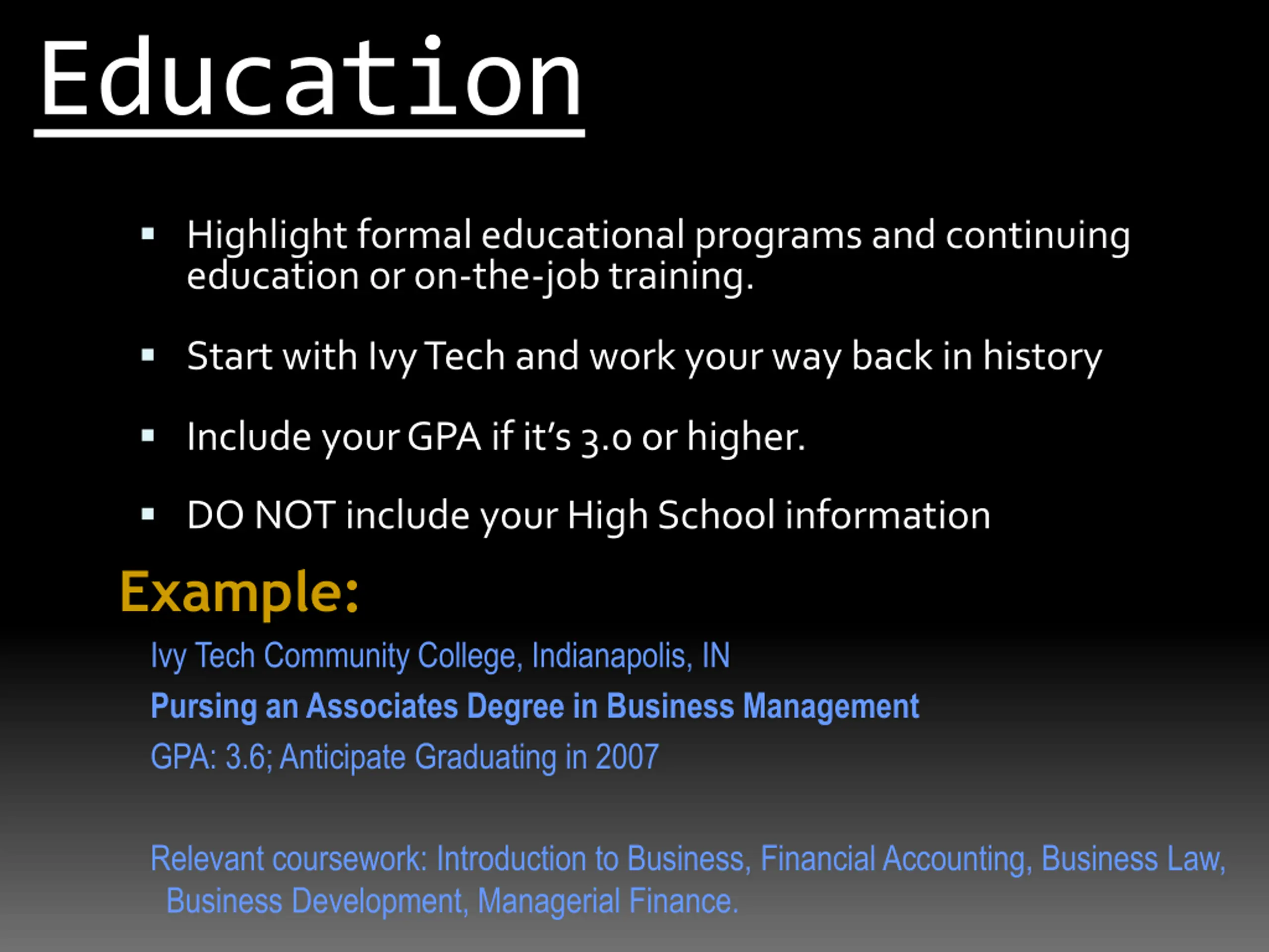 Education Overview: Highlight formal educational programs and continuing education or on-the-job training. Start with Ivy Tech and work your way back in history Include your GPA if it s 3.0 or higher. DO NOT include your High School information Example: Ivy Tech Community College, Indianapolis, IN Pursing an Associates Degree in Business Management GPA: 3.6; Anticipate Graduating in 2007 Relevant coursework: Introduction to Business, Financial Accounting, Business Law, Business Development, Managerial Finance.