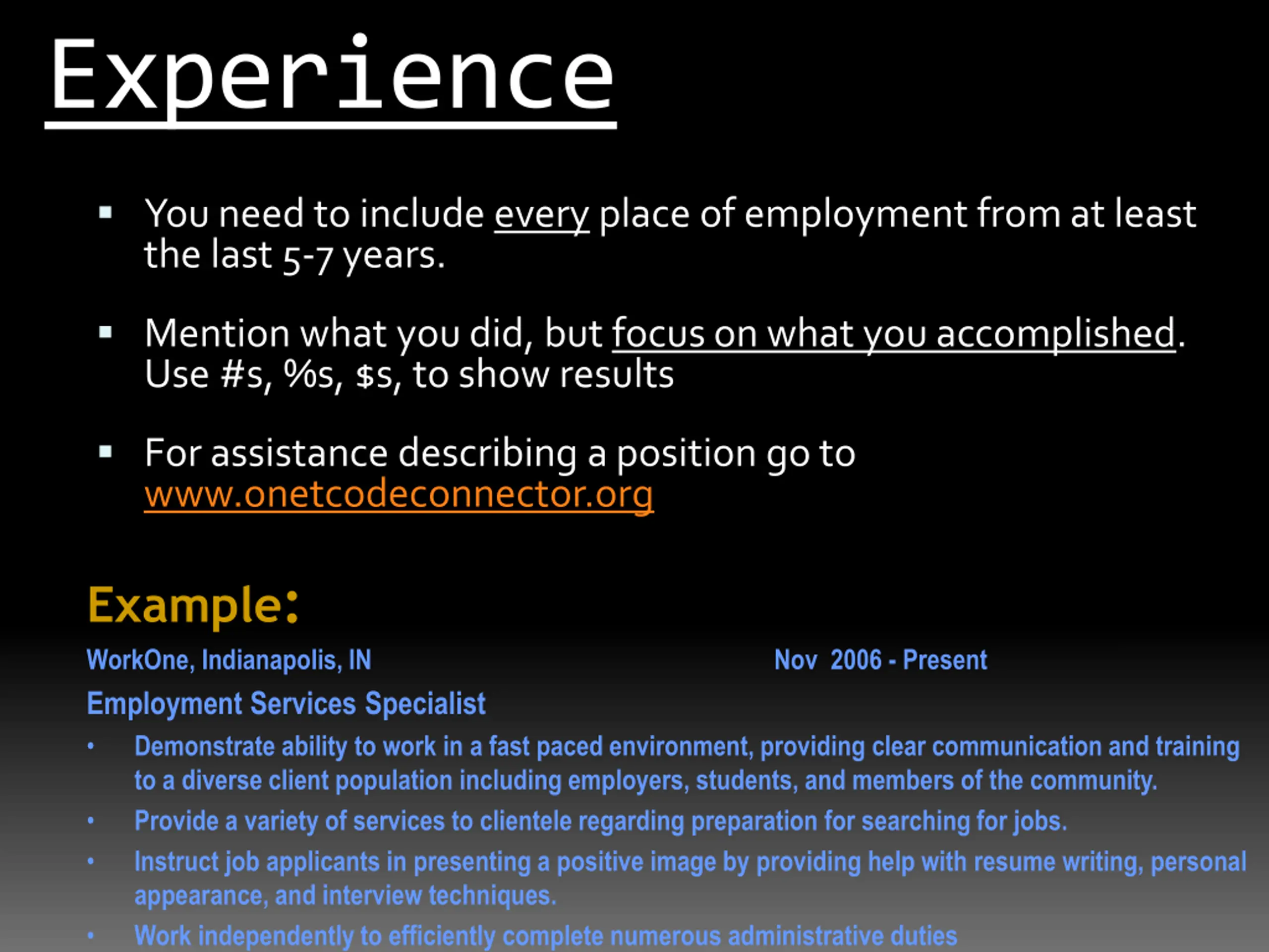 Experience Overview: You need to include every place of employment from at least the last 5-7 years. Mention what you did, but focus on what you accomplished. Use #s, %s, $s, to show results For assistance describing a position go to www.onetcodeconnector.org Example: WorkOne, Indianapolis, IN Nov 2006 - Present Employment Services Specialist Demonstrate ability to work in a fast paced environment, providing clear communication and training to a diverse client population including employers, students, and members of the community. Provide a variety of services to clientele regarding preparation for searching for jobs. Instruct job applicants in presenting a positive image by providing help with resume writing, personal appearance, and interview techniques. Work independently to efficiently complete numerous administrative duties