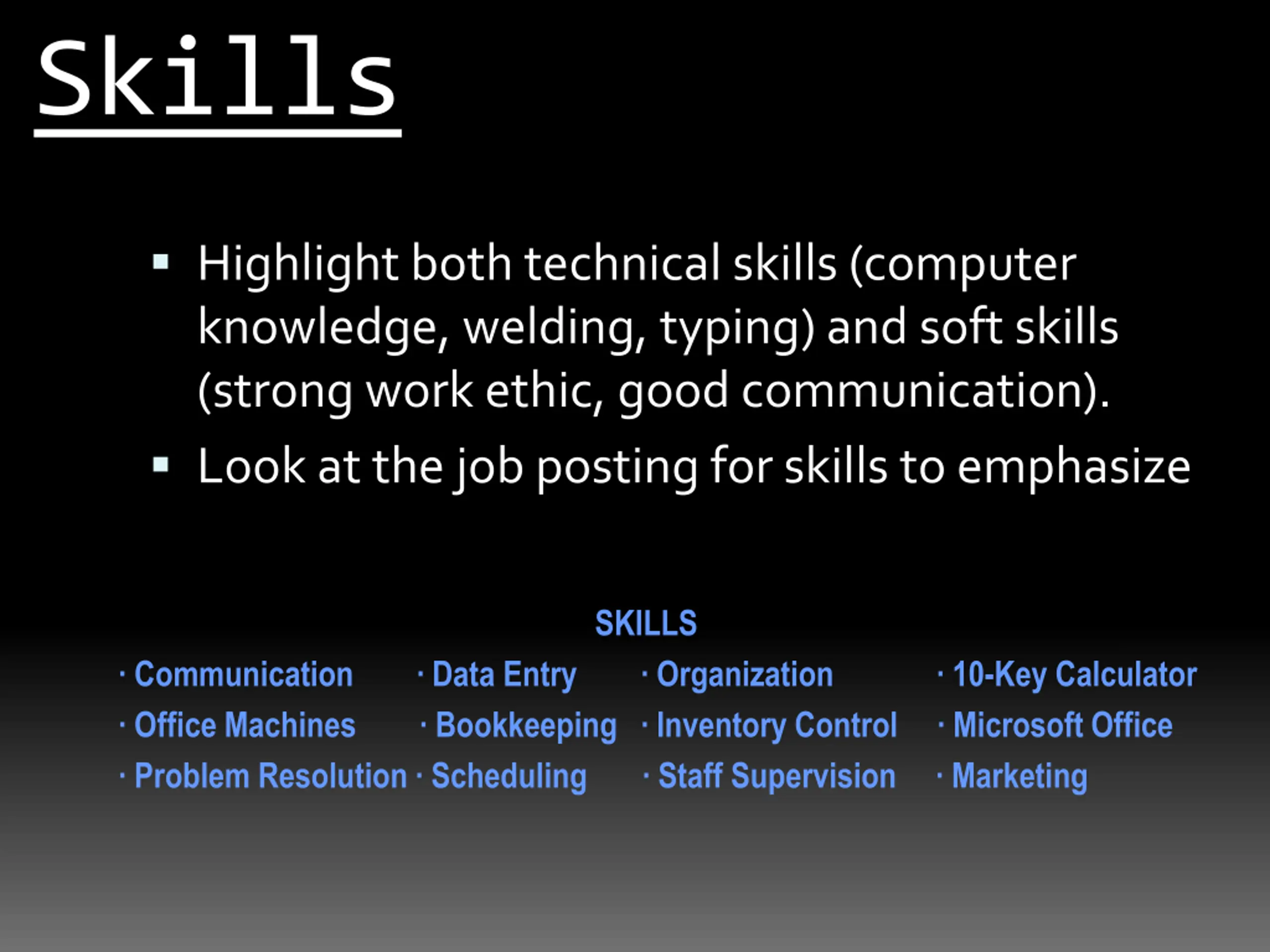Skills Overview: Highlight both technical skills (computer knowledge, welding, typing) and soft skills (strong work ethic, good communication). Look at the job posting for skills to emphasize Example: SKILLS Communication Data Entry Organization 10-Key Calculator Office Machines Bookkeeping Inventory Control Microsoft Office Problem Resolution Scheduling Staff Supervision Marketing