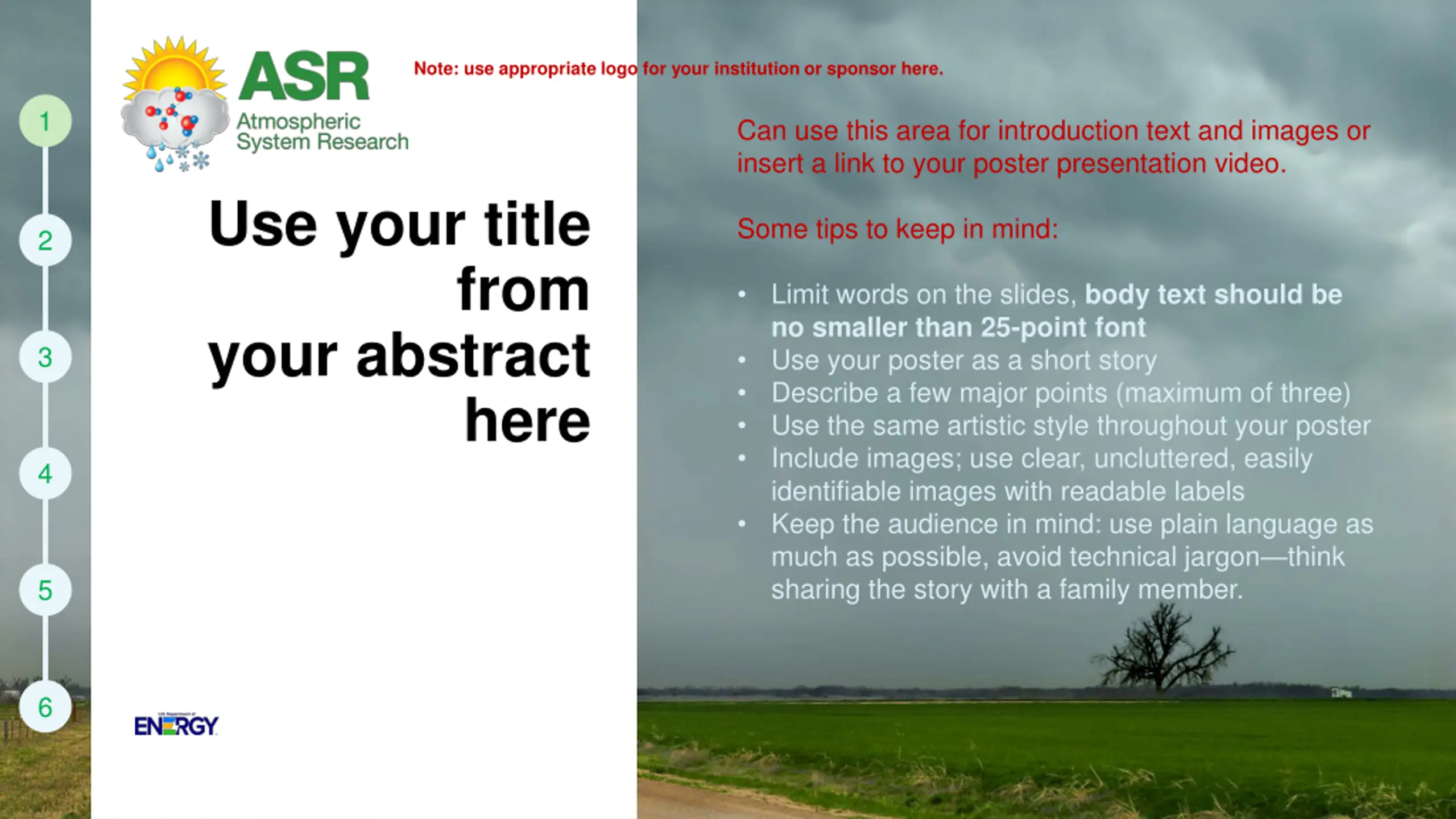 Note: use appropriate logo for your institution or sponsor here. 1 Can use this area for introduction text and images or insert a link to your poster presentation video. Use your title Some tips to keep in mind: 2 from Limit words on the slides, body text should be no smaller than 25-point font Use your poster as a short story Describe a few major points (maximum of three) Use the same artistic style throughout your poster Include images; use clear, uncluttered, easily identifiable images with readable labels Keep the audience in mind: use plain language as much as possible, avoid technical jargon think sharing the story with a family member. your abstract 3 here 4 5 6