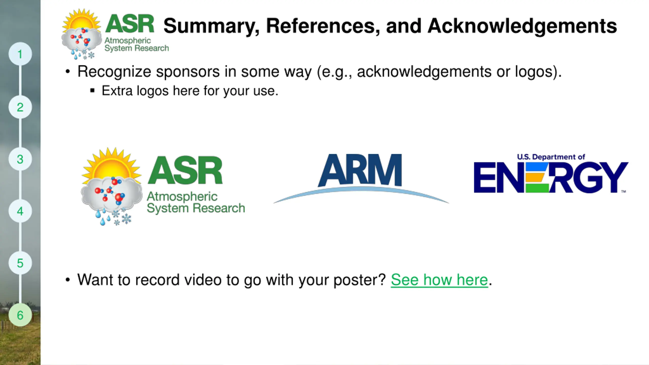 Summary, References, and Acknowledgements 1 Recognize sponsors in some way (e.g., acknowledgements or logos). Extra logos here for your use. 2 3 4 5 Want to record video to go with your poster? See how here. 6