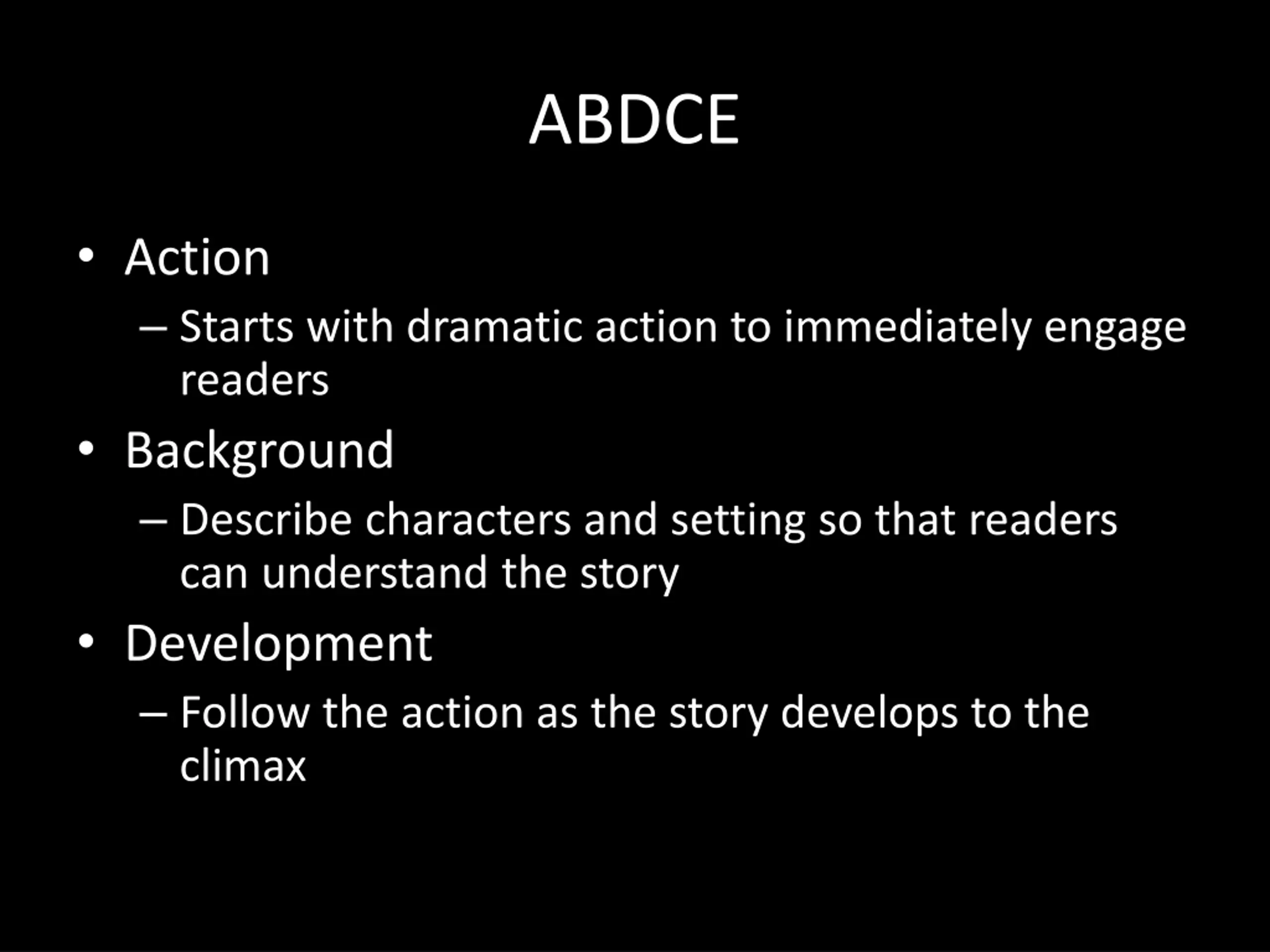 ABDCE Action Starts with dramatic action to immediately engage readers Background Describe characters and setting so that readers can understand the story Development Follow the action as the story develops to the climax