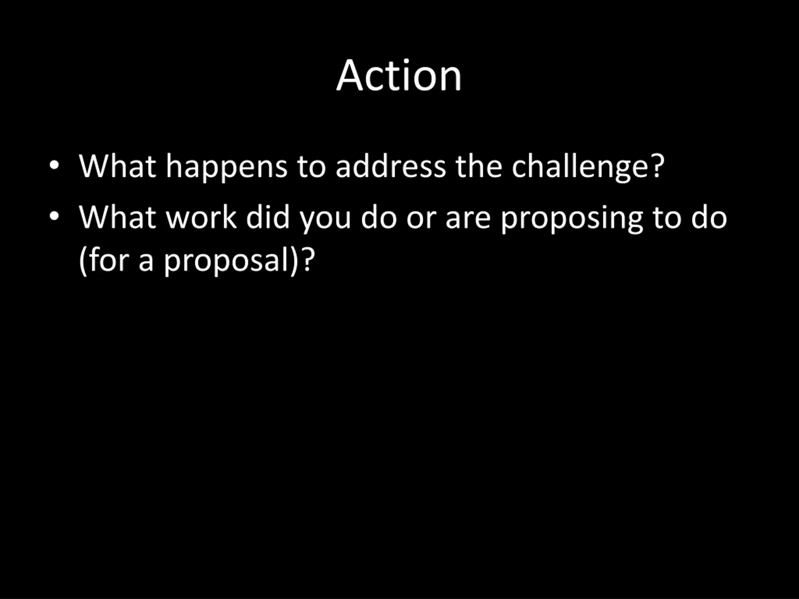 Action What happens to address the challenge? What work did you do or are proposing to do (for a proposal)?