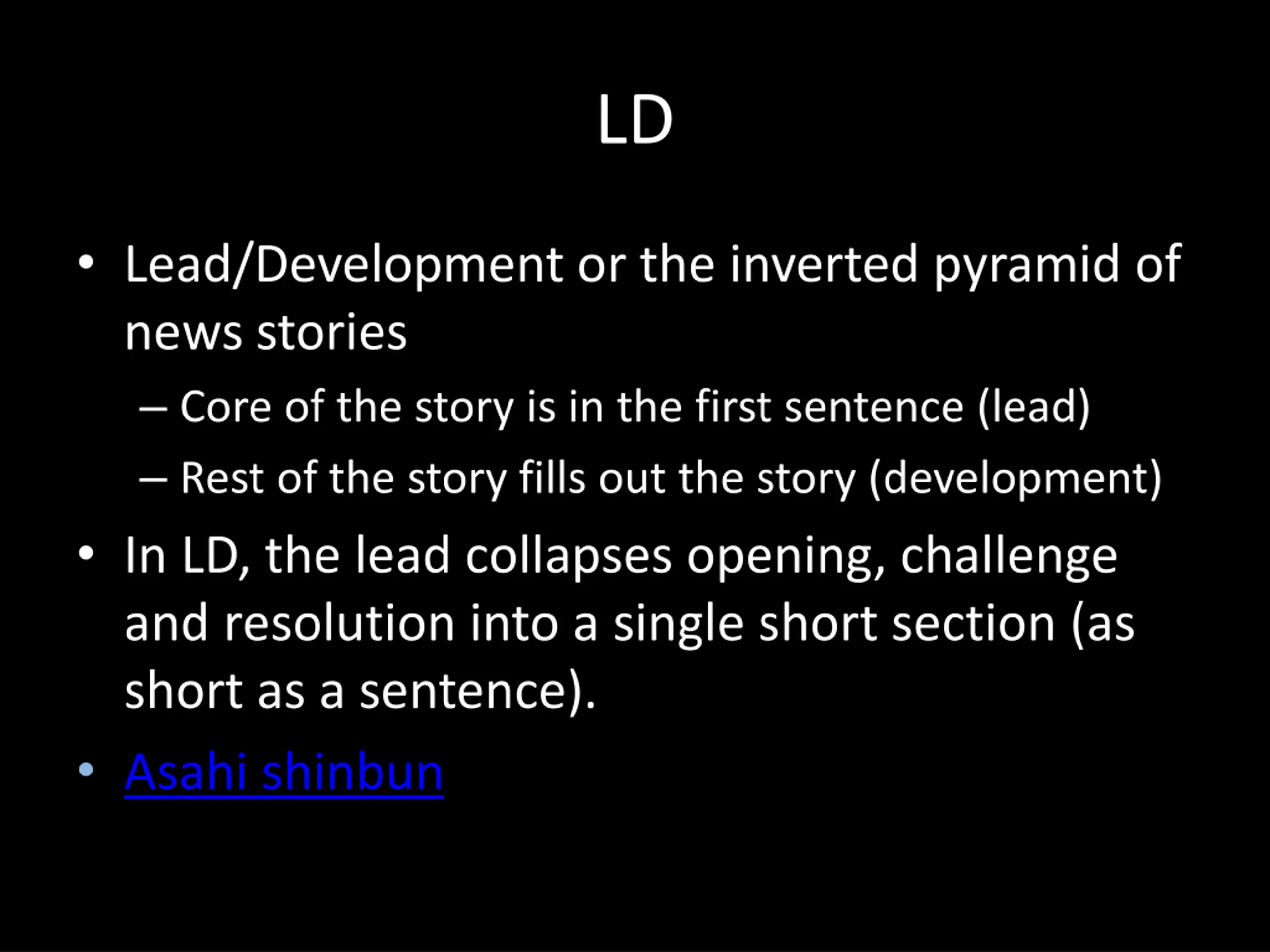 LD Lead/Development or the inverted pyramid of news stories Core of the story is in the first sentence (lead) Rest of the story fills out the story (development) In LD, the lead collapses opening, challenge and resolution into a single short section (as short as a sentence). Asahi shinbun