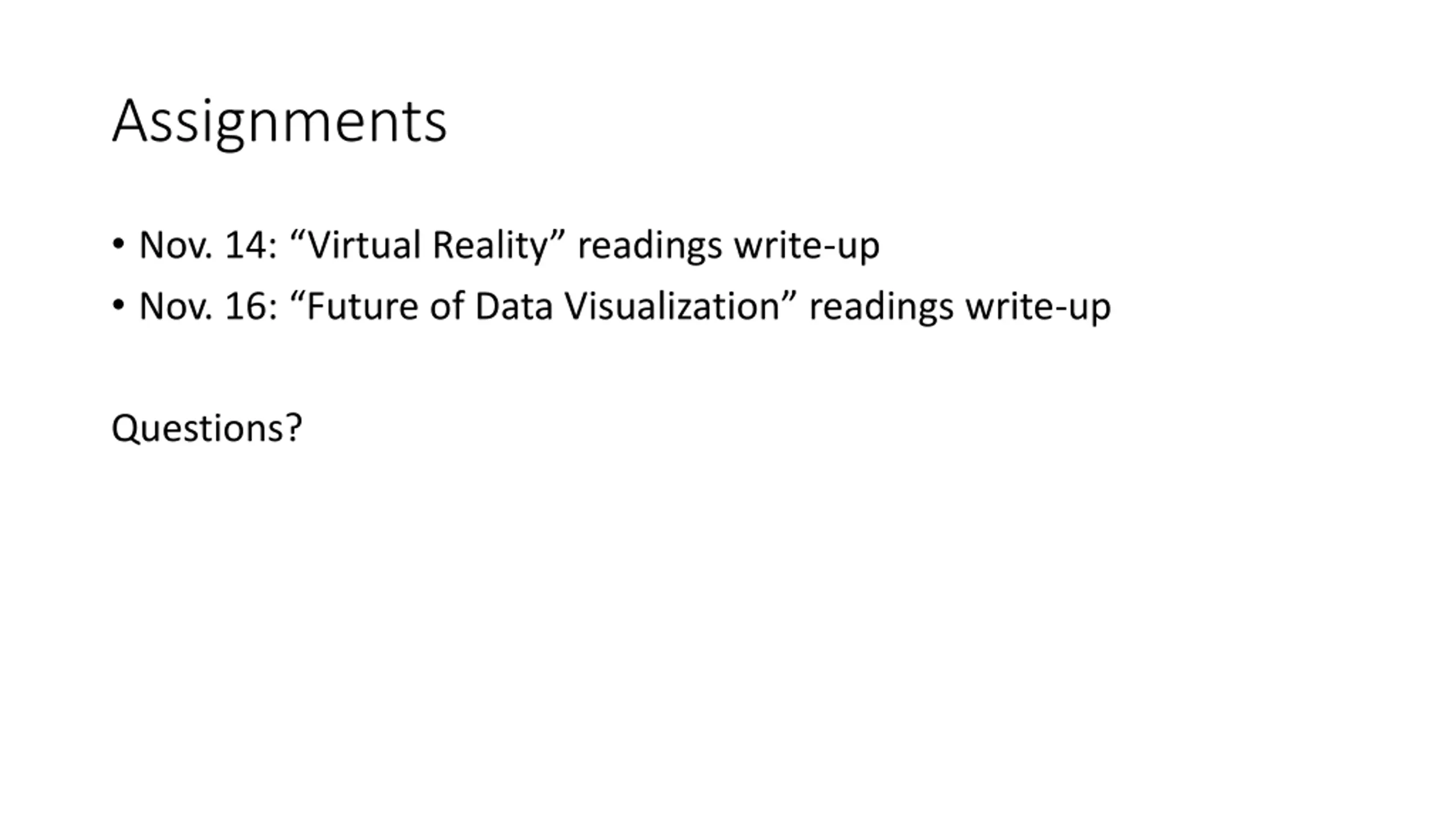 Assignments Nov. 14: Virtual Reality readings write-up Nov. 16: Future of Data Visualization readings write-up Questions?