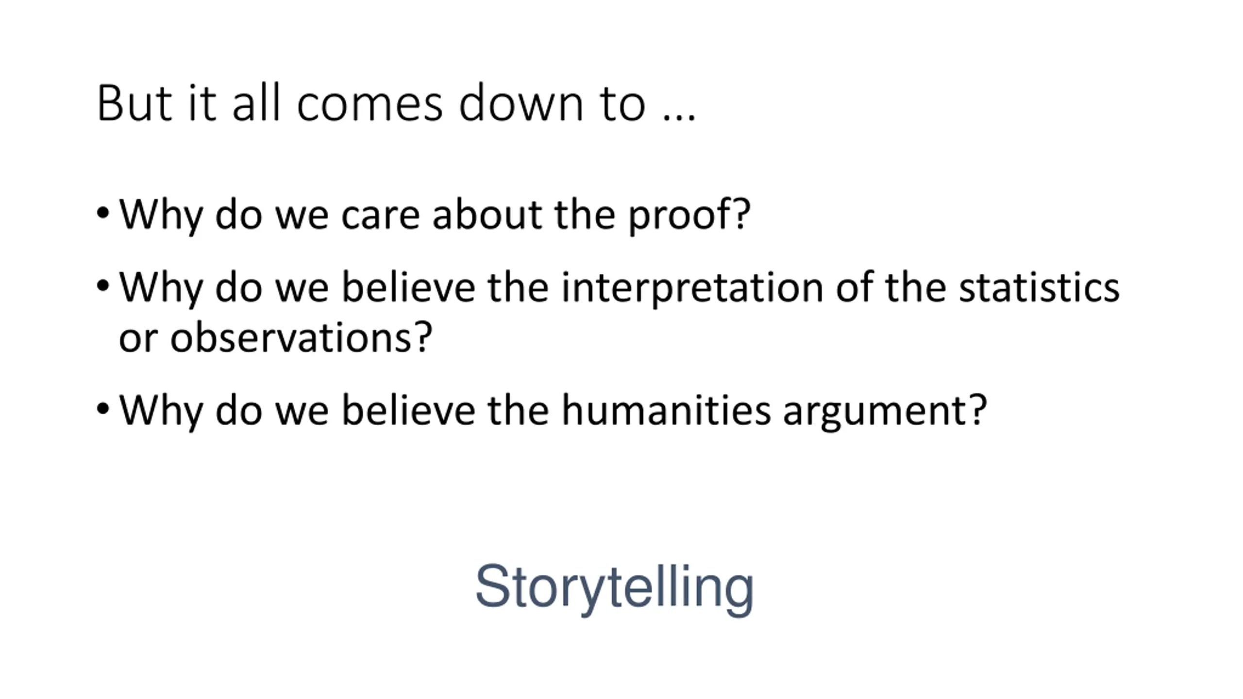 But it all comes down to Why do we care about the proof? Why do we believe the interpretation of the statistics or observations? Why do we believe the humanities argument? Storytelling