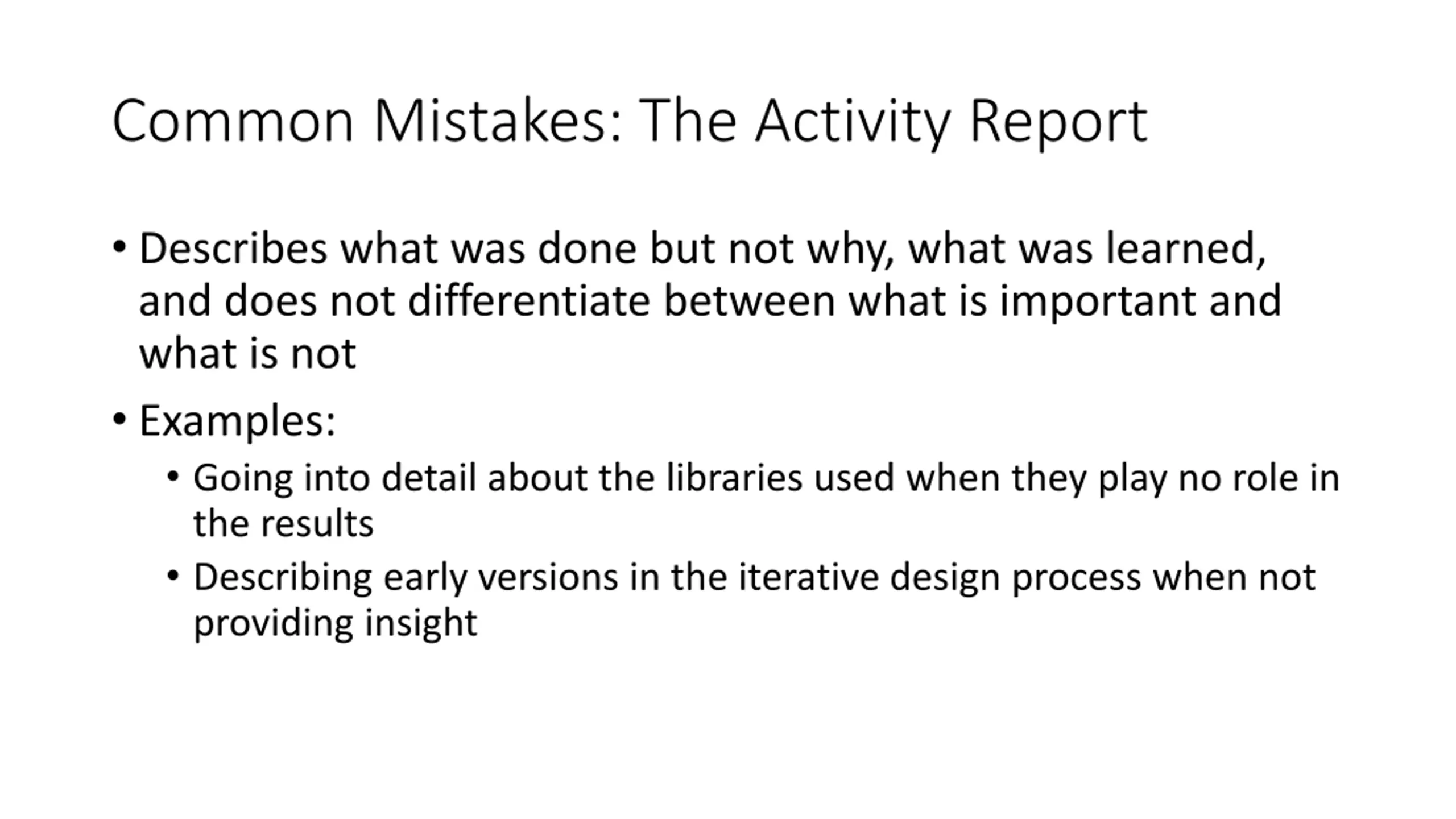 Common Mistakes: The Activity Report Describes what was done but not why, what was learned, and does not differentiate between what is important and what is not Examples: Going into detail about the libraries used when they play no role in the results Describing early versions in the iterative design process when not providing insight